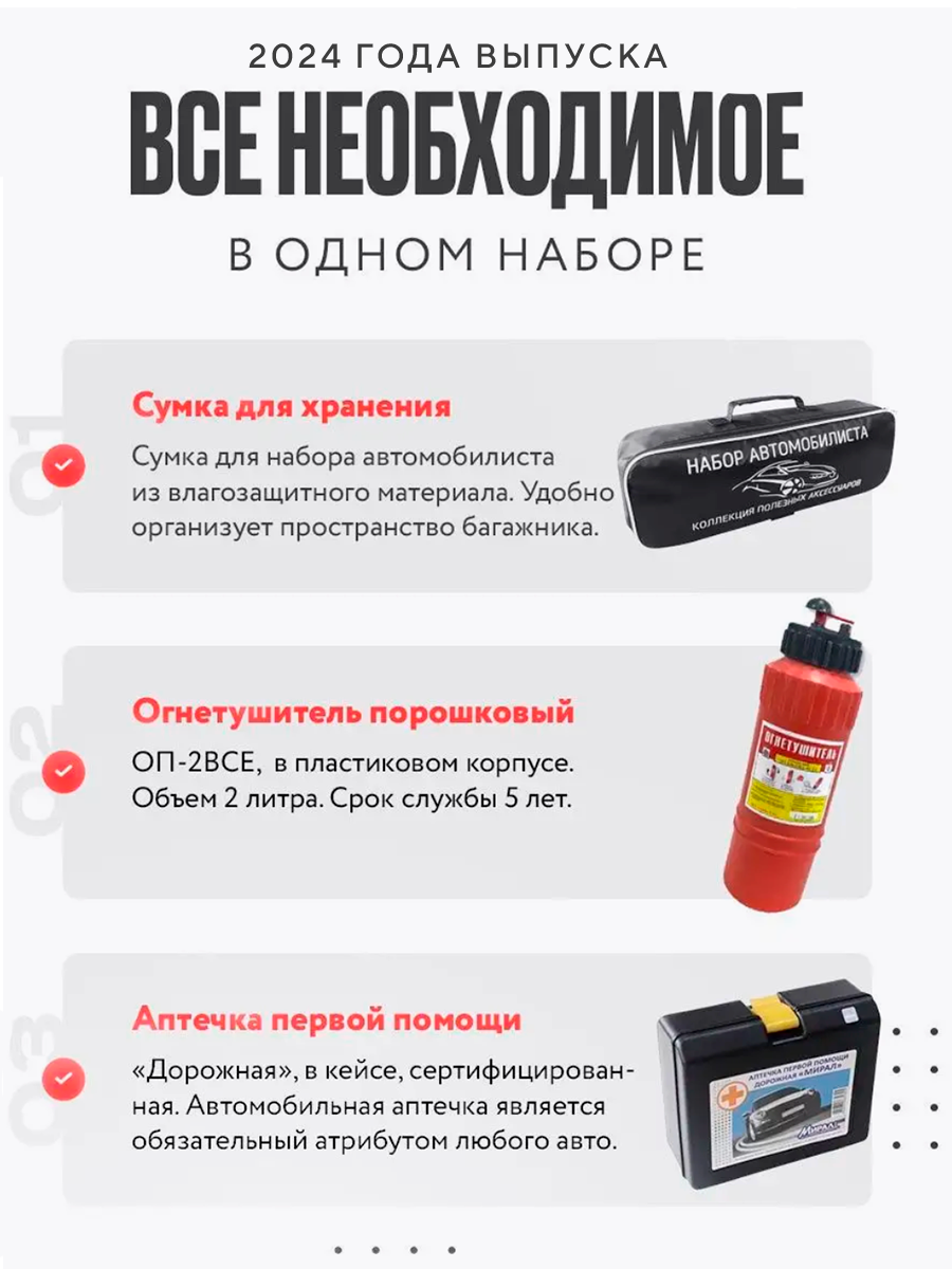 Набор автомобилиста с огнетушителем и аптечкой, набор в машину для техосмотра по госту 2023, 7 предметов информация: