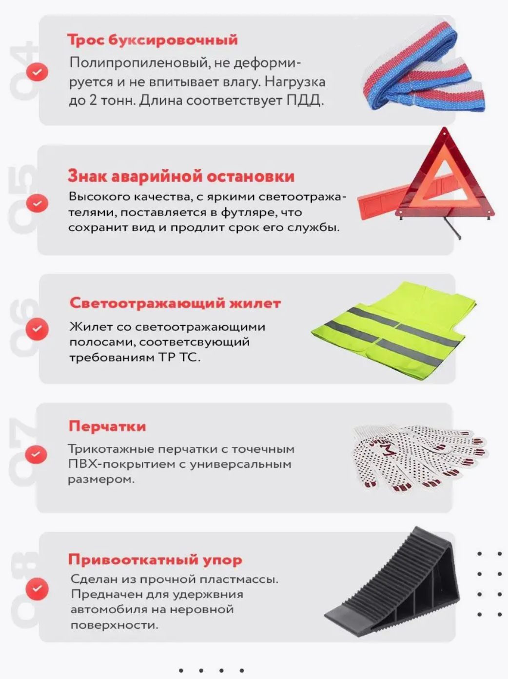 | В наборе | аптечка / жилет светоотражающий / знак аварийной остановки / огнетушитель / перчатки / трос буксировочный / упор(башмак) противооткатный |