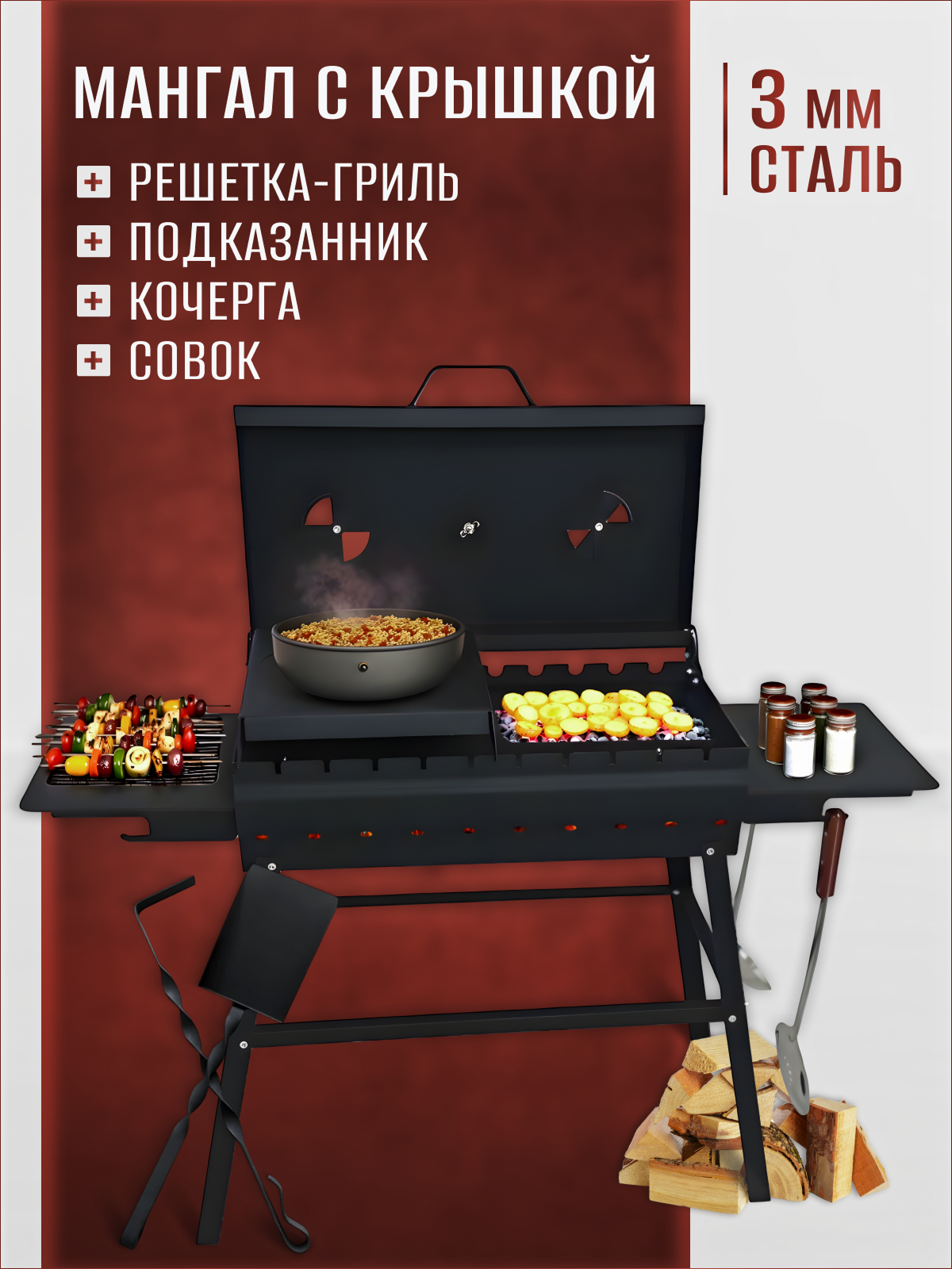 Отзывы на Мангал 3 мм разборный с крышкой, подказанником, решеткой гриль, совком и кочергой