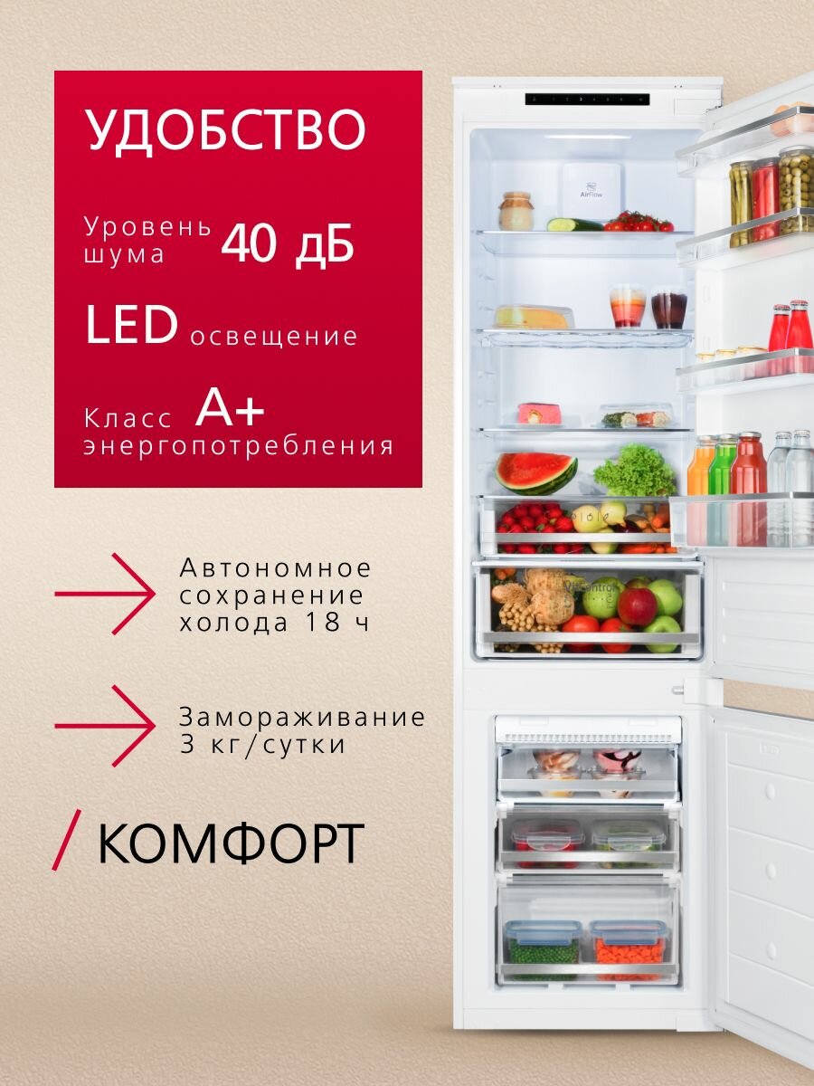 10 цен на Встраиваемый холодильник Hansa BK347.3NF, 281 л, No Frost в морозильной камере, 40 дБ, автономное сохранение холода 18 часов, материал полок - стекло, А+, белый