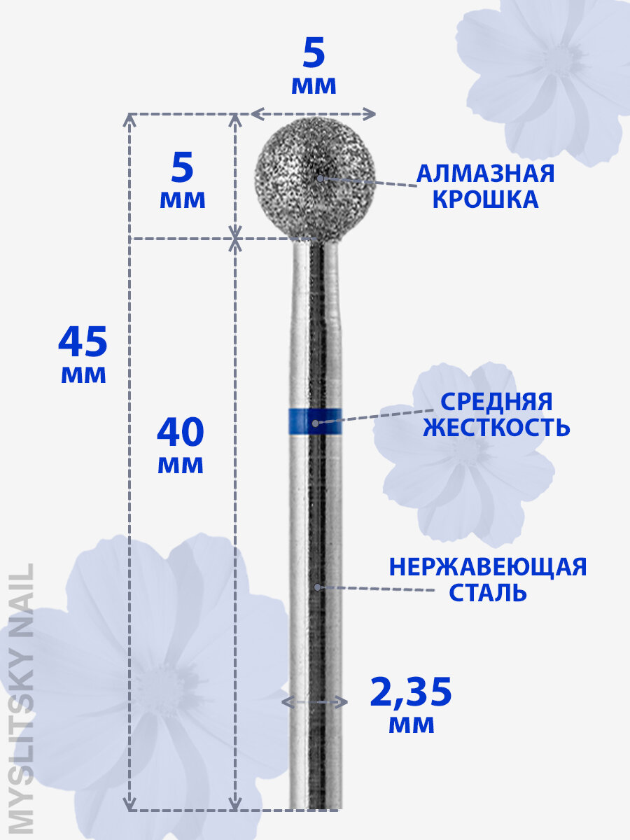 Фреза для маникюра и педикюра алмазная ВладМиВа для кутикулы 806 104 001 524 050 Средняя шар (упаковка 5 шт) информация: