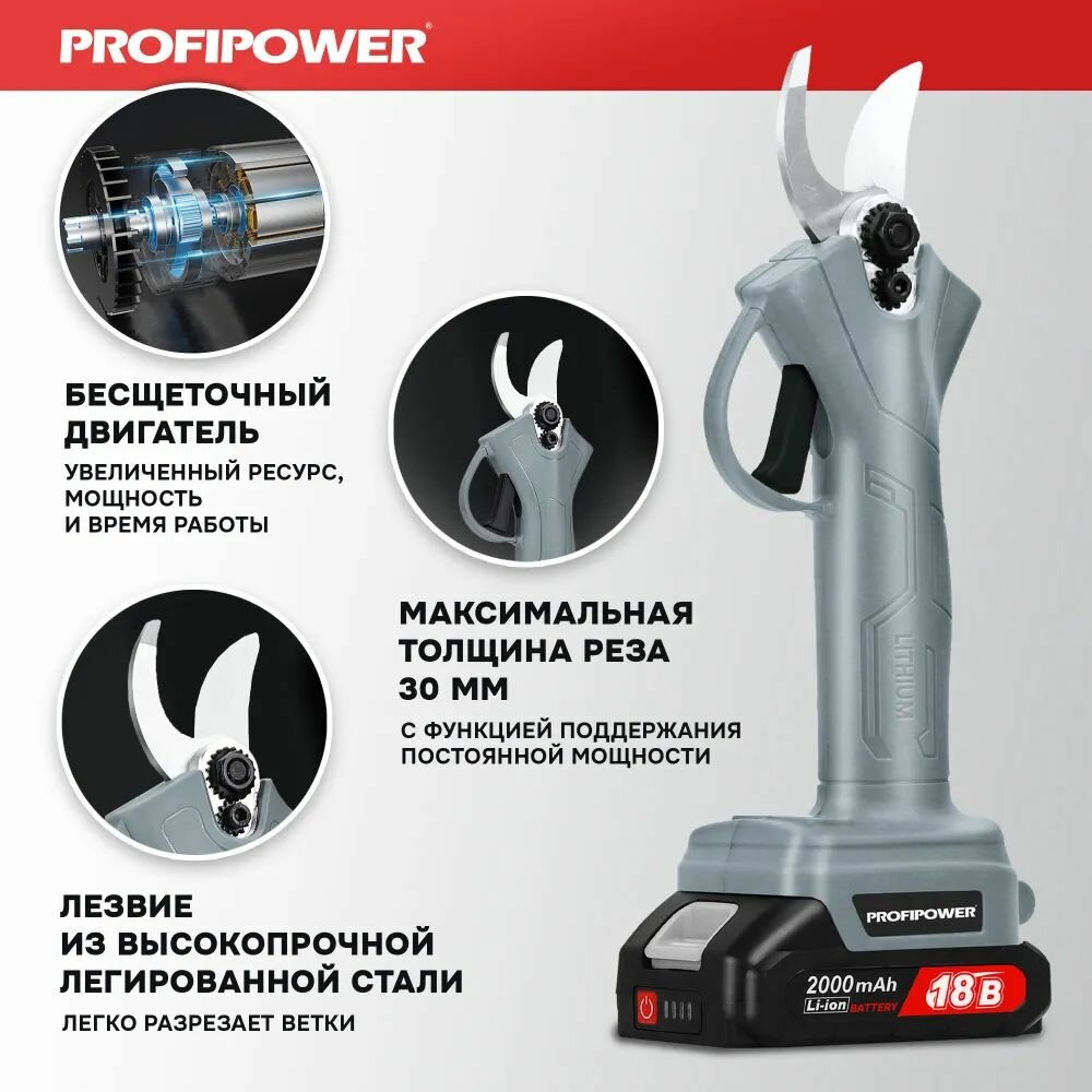 PROFIPOWER Бесщеточный аккумуляторный садовый секатор 18B, MKGSP (2шт Li- ion аккумулятора,2.0Ач, толщина реза: 3.0мм. ) E0099