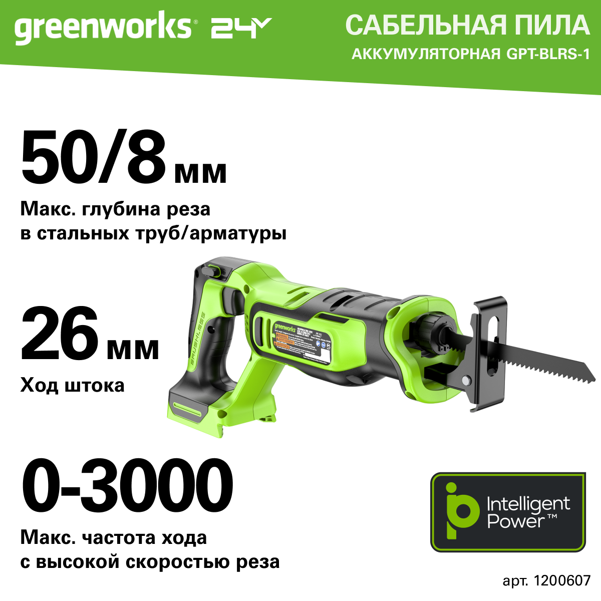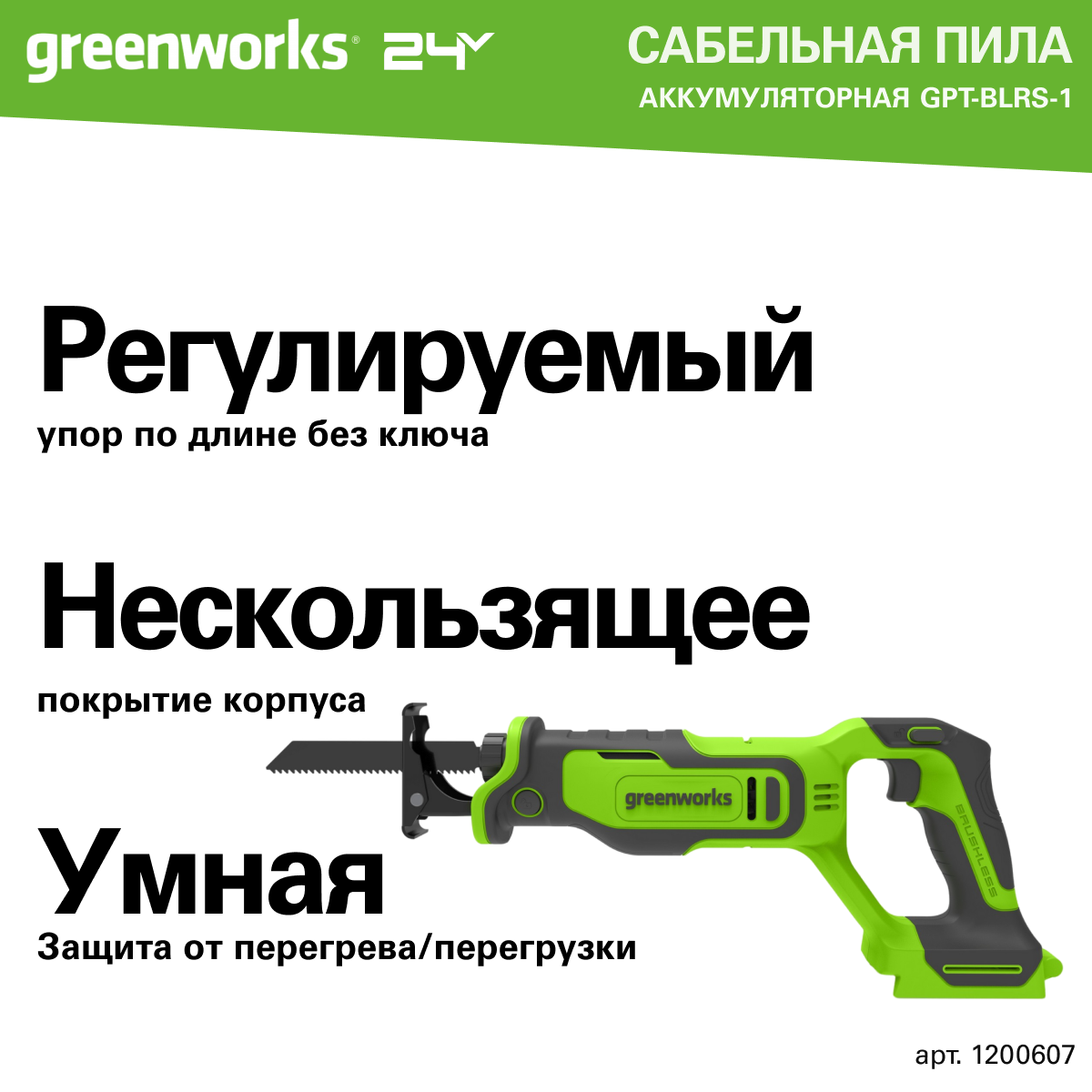 Пила сабельная Greenworks GPT-BLRS-1, 24V, бесщеточная, 0-3000/мин, 115 мм, без АКБ и ЗУ (1200607) информация:
