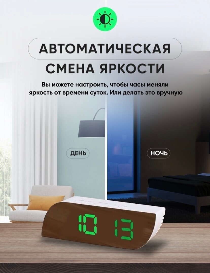 Электронные часы будильник, настольные с зеркальным дисплеем и подсветкой, зеленые цифры информация: