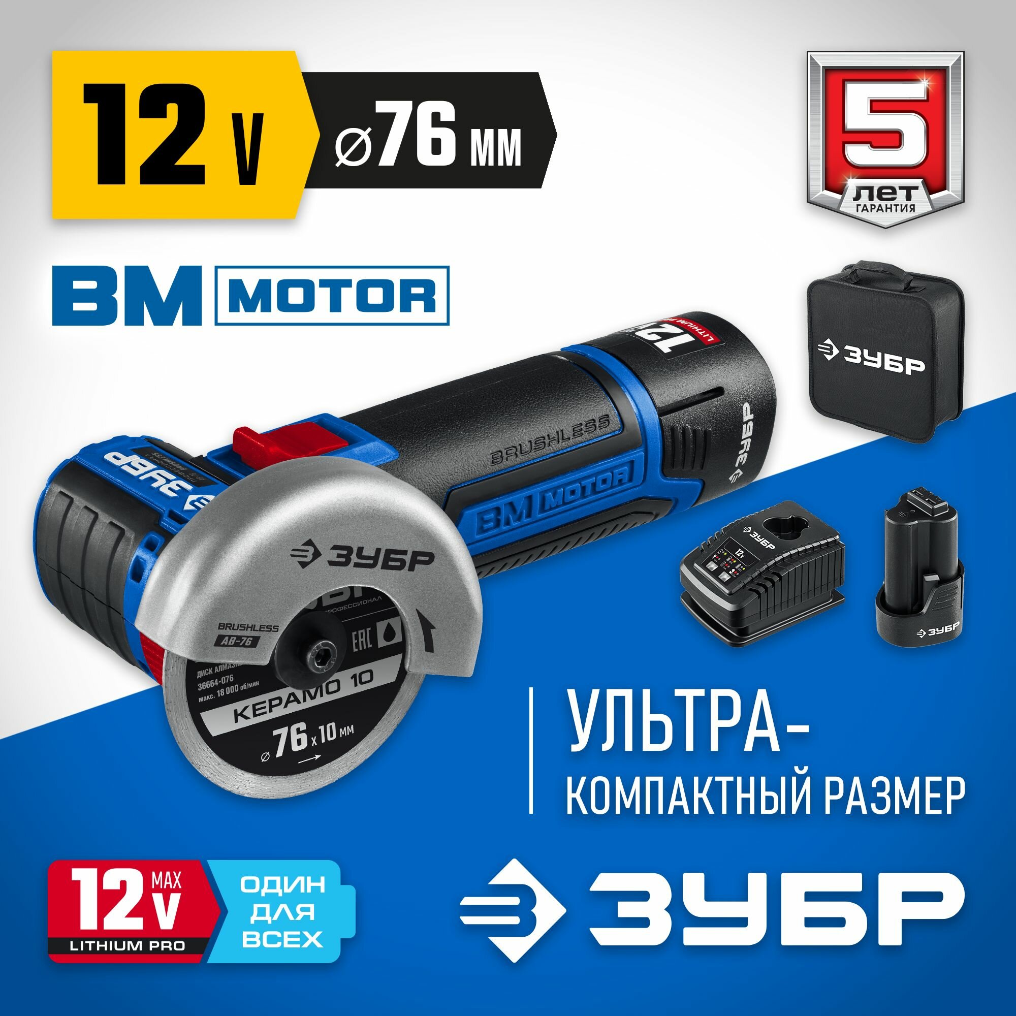 Бесщеточная УШМ (болгарка) ЗУБР 12 В, d76 мм, 2 АКБ тип Т7 (2 Ач), сумка, Профессионал (AB-76-22) информация:
