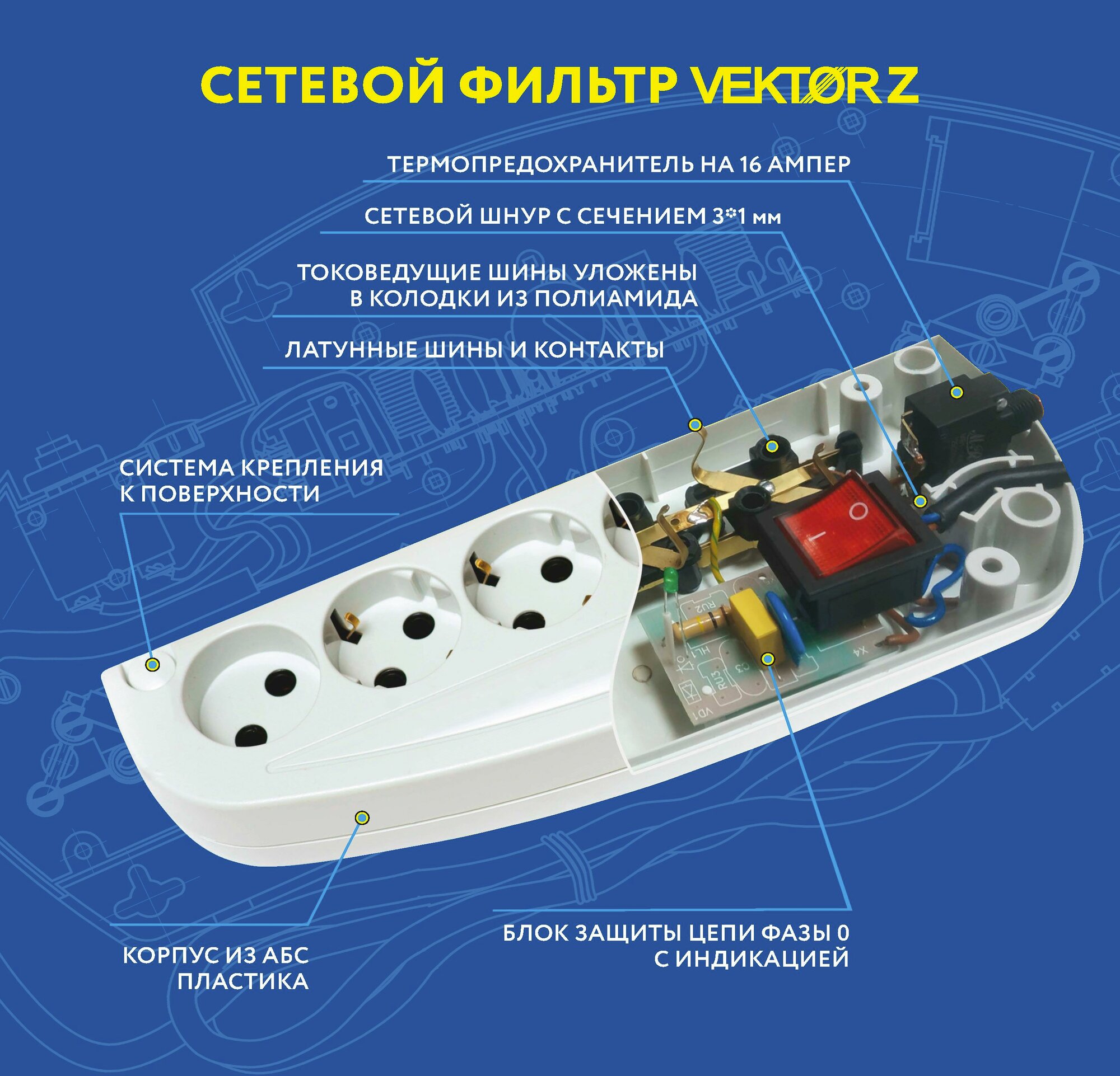 10 цен на Сетевой фильтр Vektor Z 3.5 кВт белый 1.8м (для бытовой техники, повышенная мощность)
