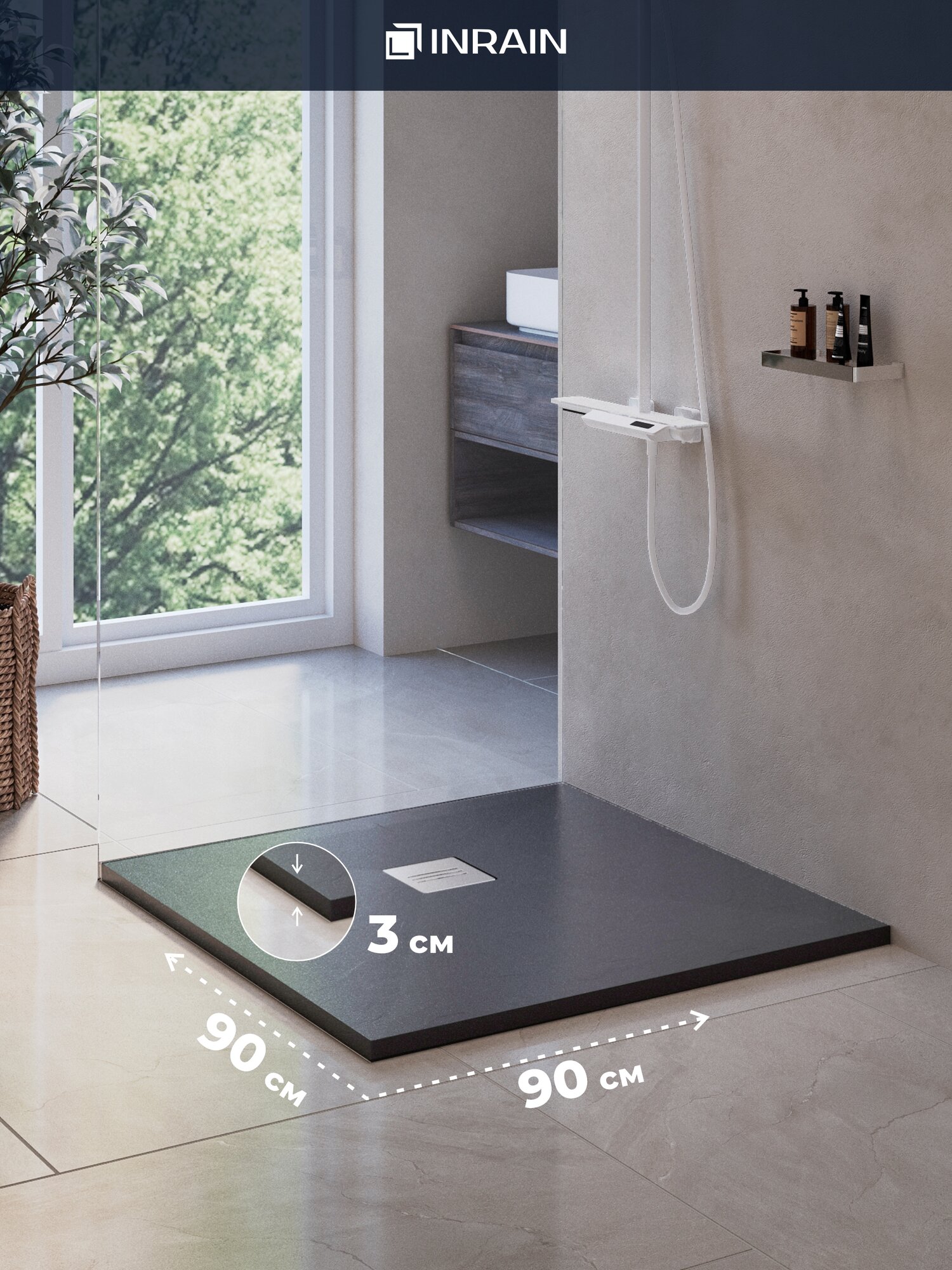 Отзывы на Премиальный поддон для душа из искусственного камня INRAIN 90х90 см, квадратный, графит, с решеткой на сифон