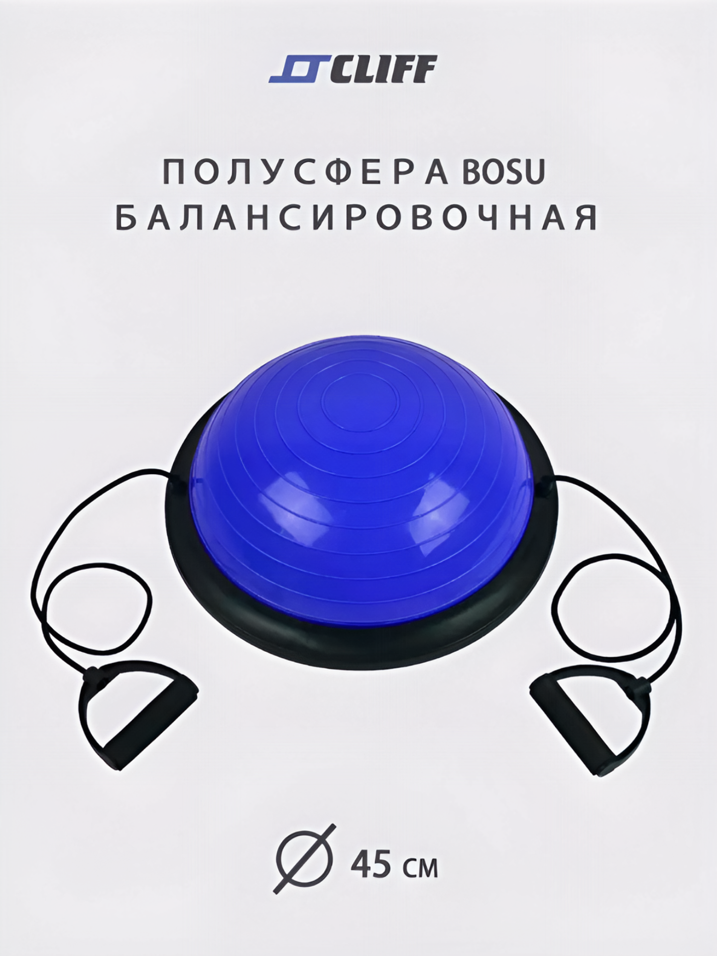 Полусфера гимнастическая BOSU CLIFF 45*20см, синяя, с эспандерами, с насосом/ Балансировочная платформа/ Степ платформа/Мяч Босу