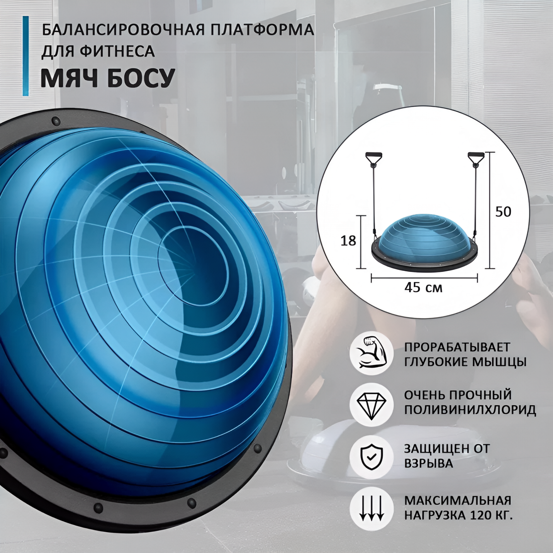 Полусфера балансировочная BOSU CLIFF 45*20см, синяя, с эспандерами, с насосом. Балансировочная платформа. Степ платформа информация:
