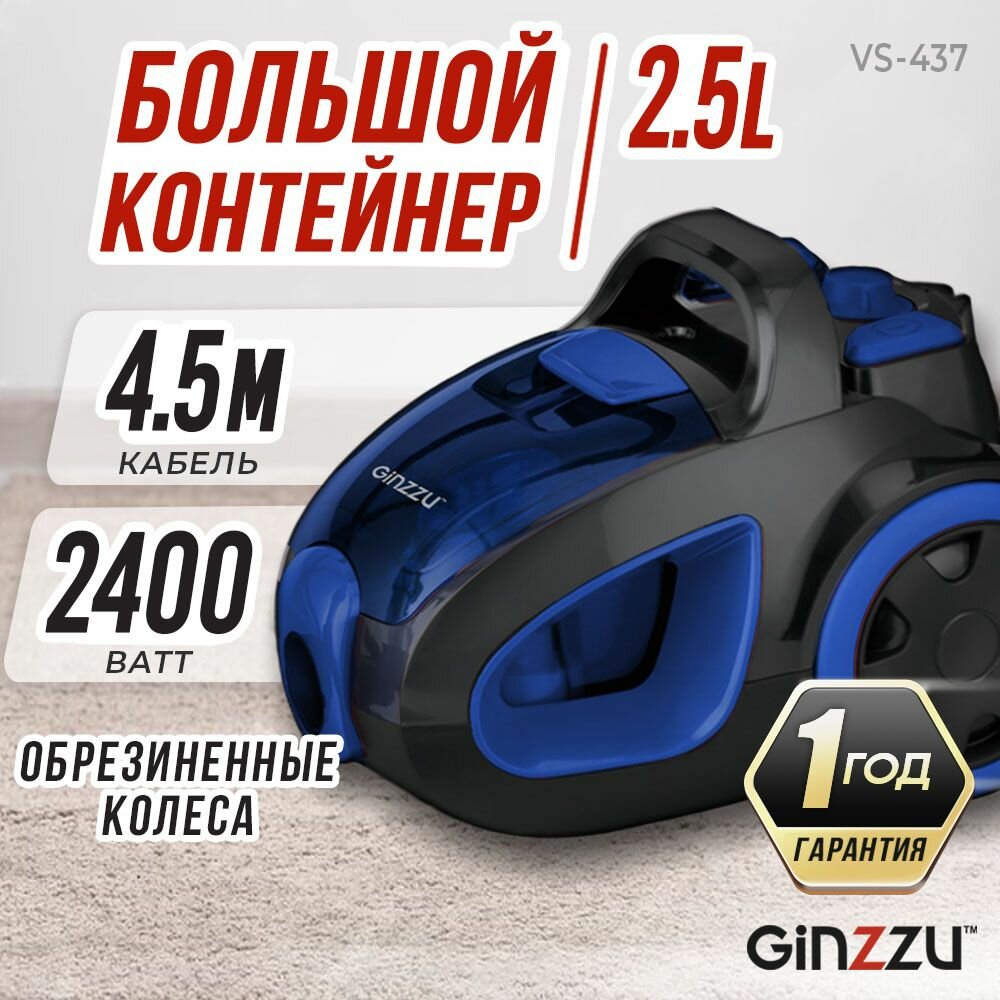 Пылесос Ginzzu VS437 синий, 2400Вт c двумя моющимися HEPA фильтрами и регулятором мощности информация: