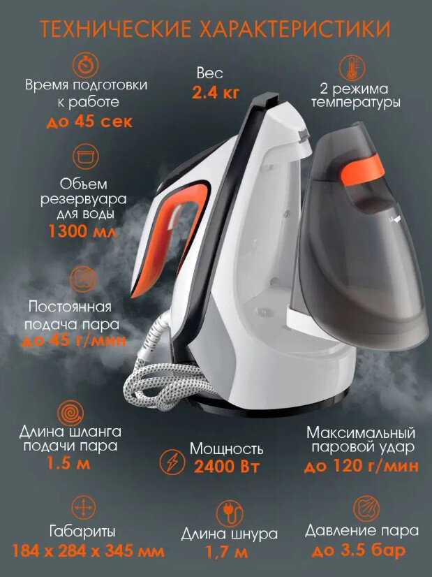 | Дополнительные функции | паровой удар / постоянная подача пара / сигнал автоотключения / система самоочистки / сухая глажка |