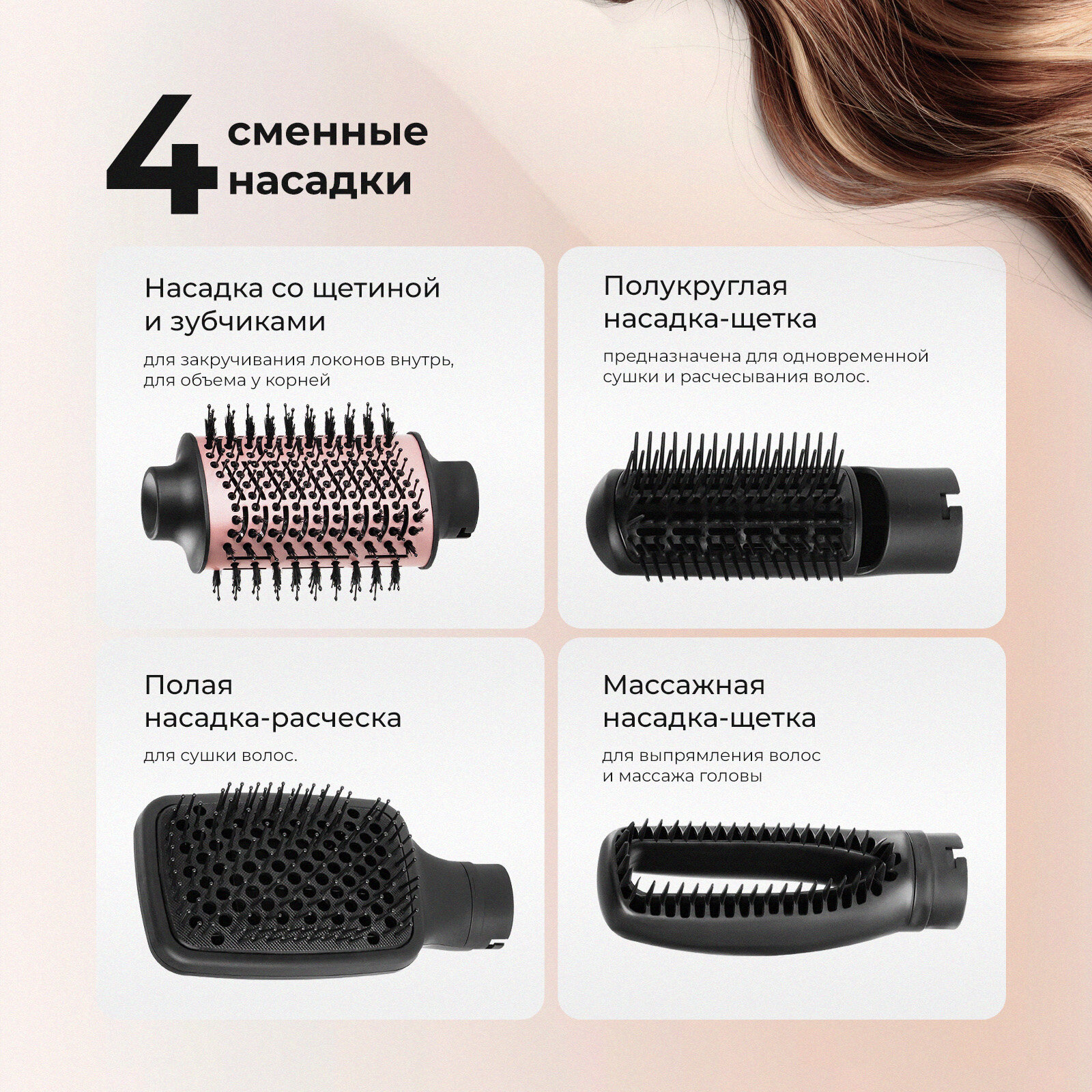 | Дополнительная информация | Насадка овальная со щетиной и зубчиками предназначена для закручивания локонов внутрь/наружу и придания объема у корней. Полая насадка-концентратор предназначена для сушки волос. |