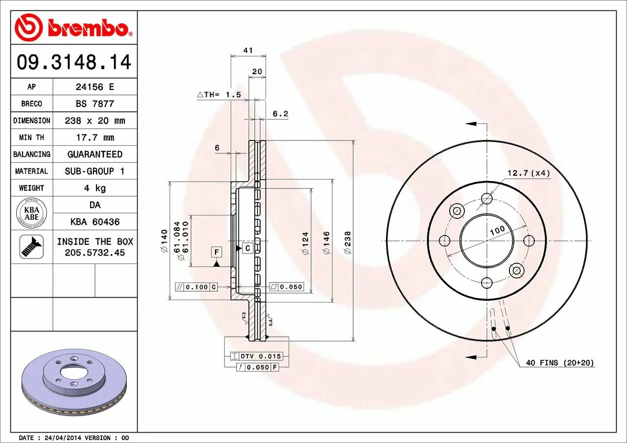 BREMBO 09314814 (09072 / 09314810 / 09314814) диск тормозной standard перед (Комплект 2 штуки)