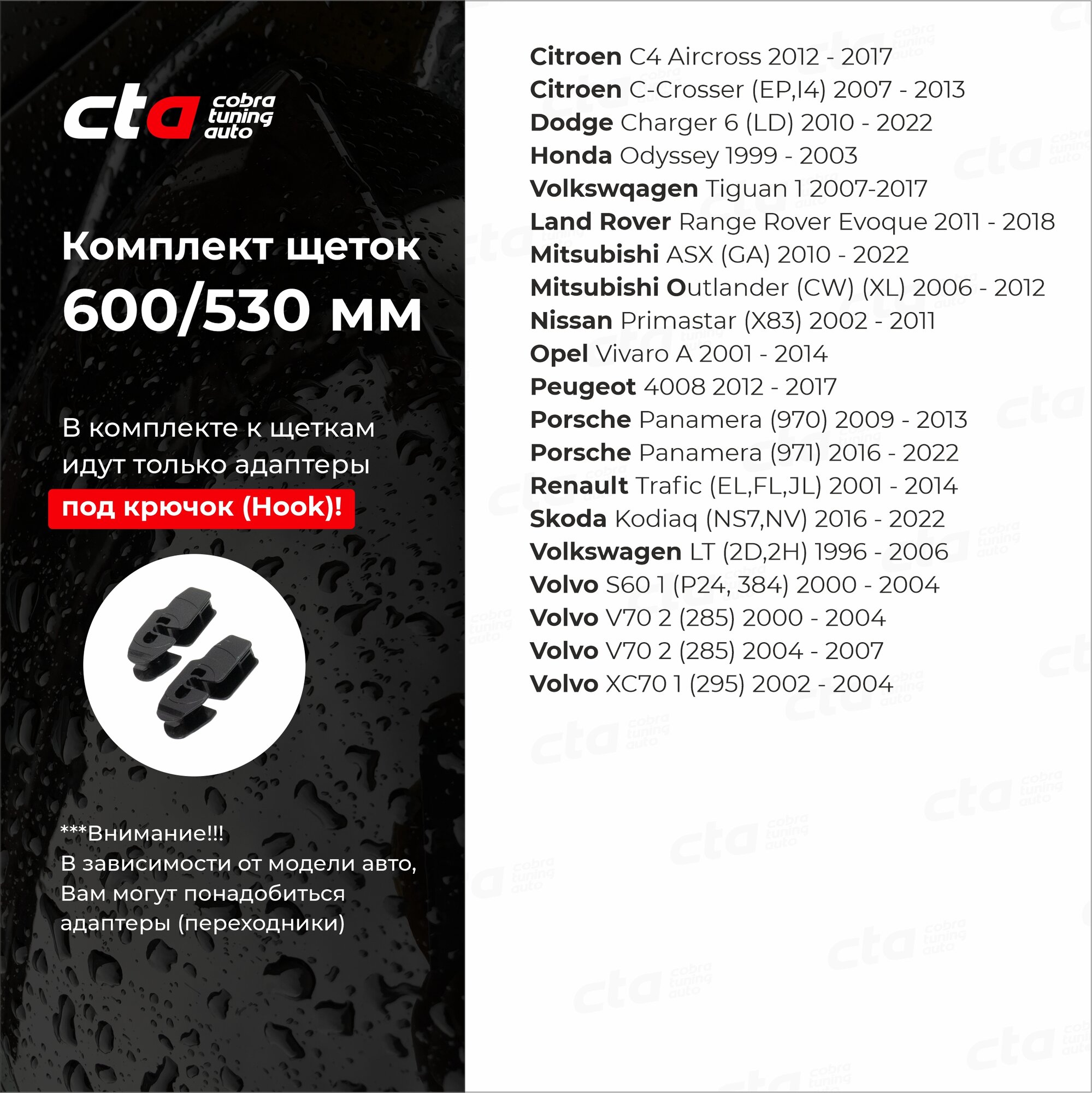| Подробная комплектация | Гибридные автомобильные щетки, комплект из 2 шт. + 2 адаптера крючок (hook) |