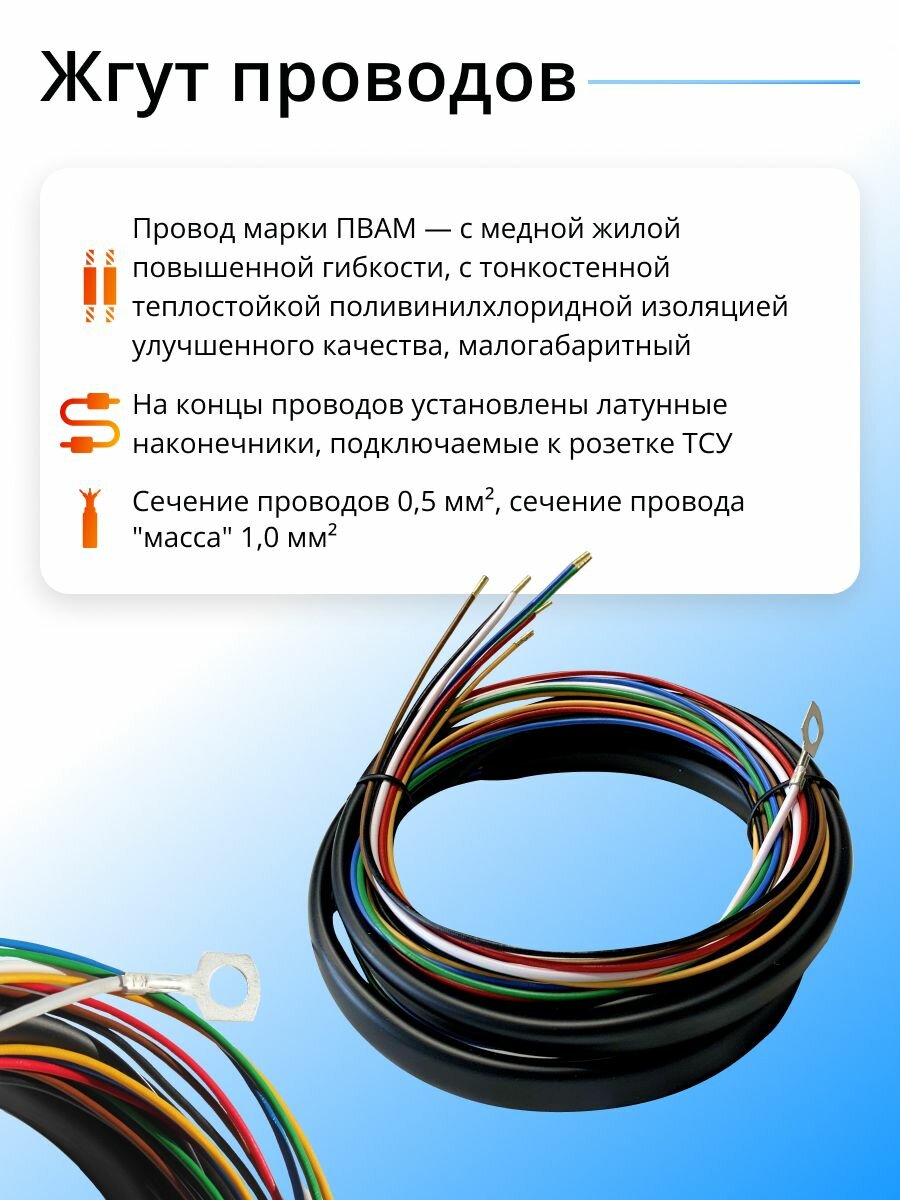 | Подробная комплектация | - Розетка ТСУ 7 - контактная с защитным пыльником (ISO 1724). Материал проводника - Провод марки ПВАМ (ссылка на производителя). Сечение проводников: 6 проводов 0,5мм2 (красный, синий, желтый, зеленый, коричневый, черный) длина 1,7 метра, 1 проводник 1,0мм2 (белый) длина 1,6 метра. Обработка кабеля наконечниками: На концы проводов, подключаемые к розетке ТСУ, установлены металлические наконечники, с другой стороны провода не обработаны, кроме провода 1,0мм2 (белый) на нем установлена клемма-кольцо с внутренним диаметром 6,2-6,8мм для установки под гайку М6 ("Масса"). Групповая изоляция: Все проводники собраны в общую ПВХ трубку для автомобильной промышленности с внешним диаметром 10мм. Монтажный комплект: Винт DIN7985 М4*35 - 3 шт., Гайка с фланцем DIN6923 M4 рифленая - 3 шт., упаковка для монтажного комплекта - 1 шт. |