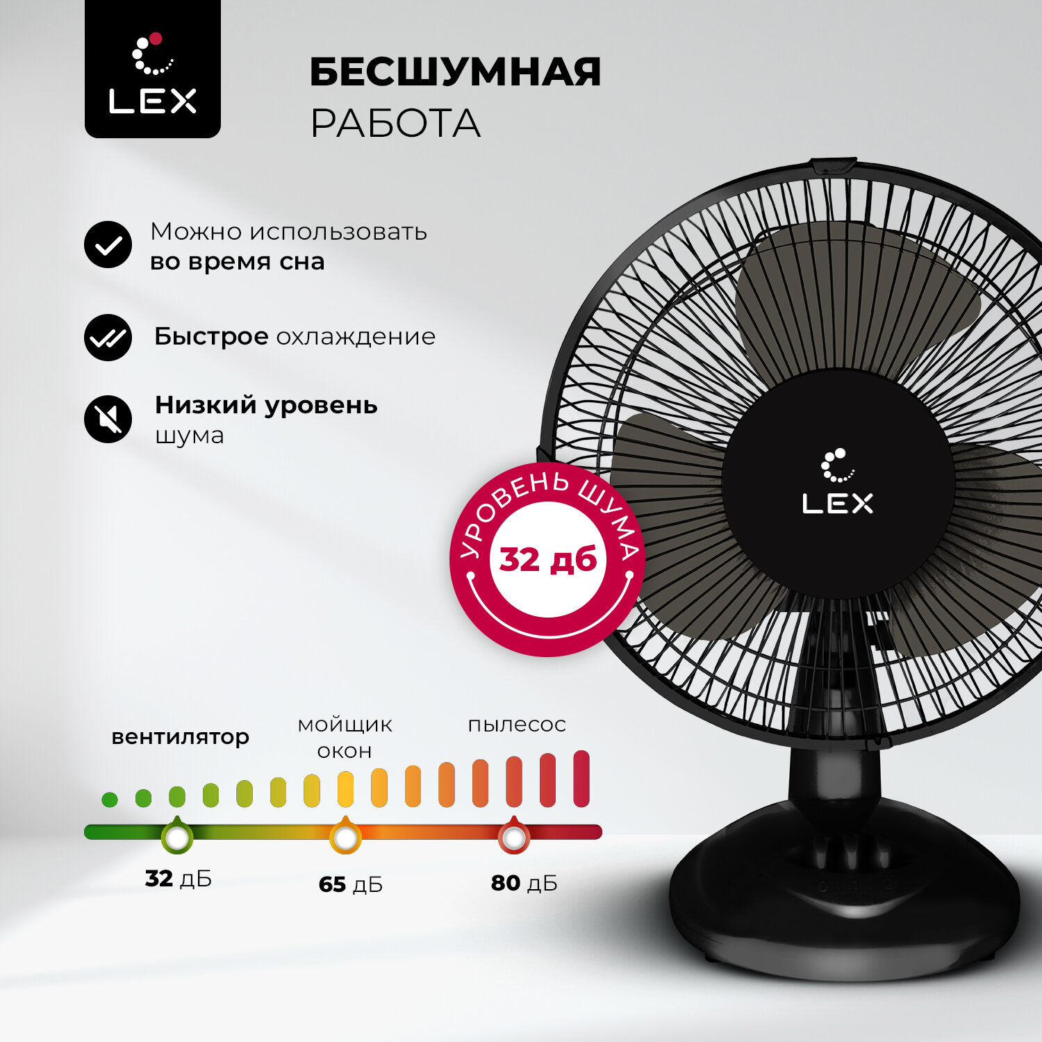 10 цен на Вентилятор настольный LEX LXFC 8379, диаметр лопастей 23 см, мощность 30Вт, 2 скорости.