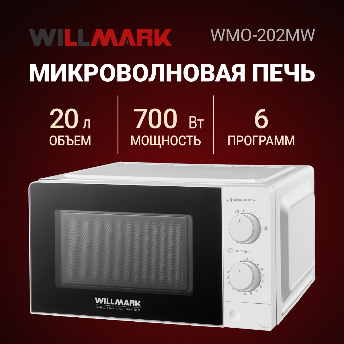 Микроволновая печь WILLMARK WMO-202MW (20л,700Вт, механич. ПУ, кнопка д/л откр. дверцы,6 ур. мощн, белая) информация: