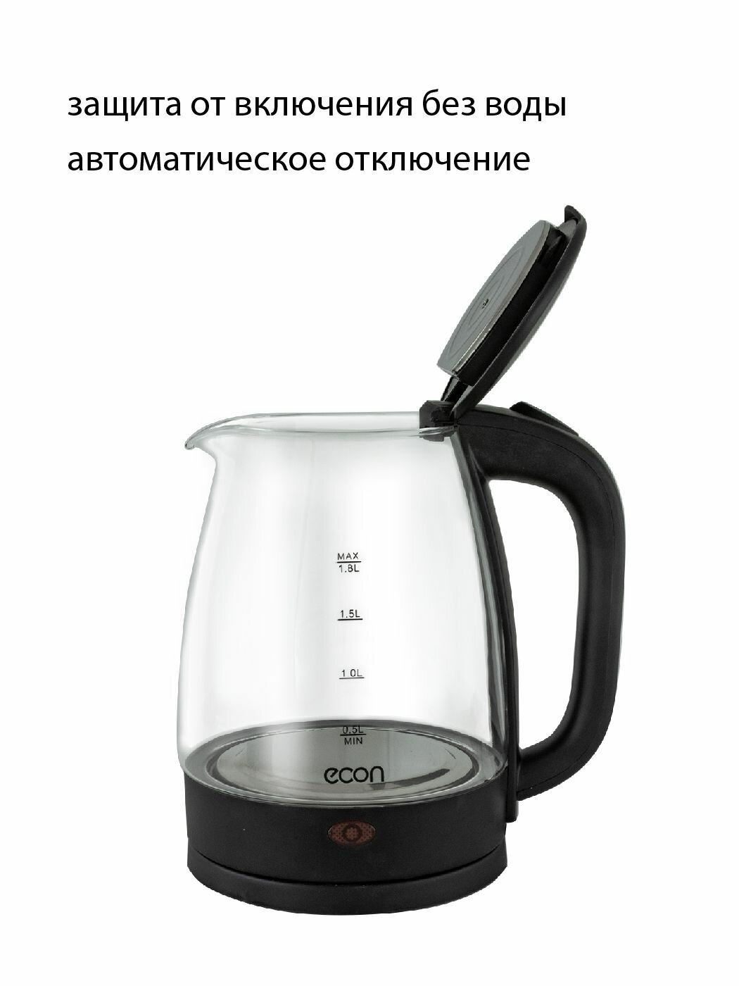 Чайник электрический стеклянный ECON ECO-1825KE 1,8 л, защита от включения без воды, автоотключение, 1500 Вт информация: