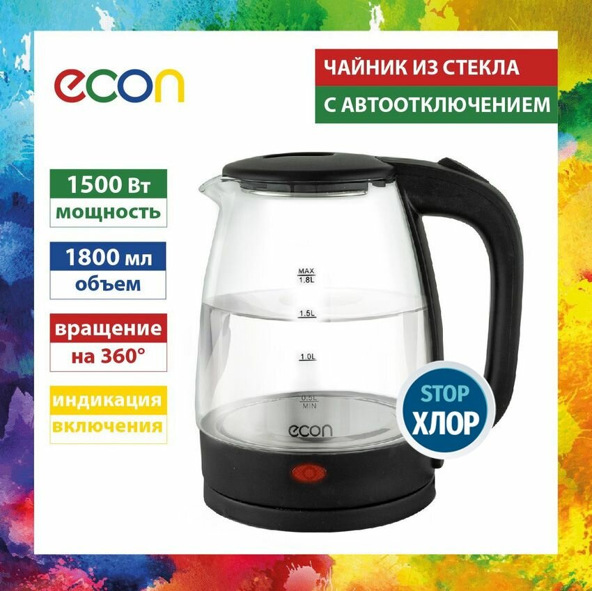 Отзывы на Чайник электрический стеклянный ECON ECO-1825KE 1,8 л, защита от включения без воды, автоотключение, 1500 Вт