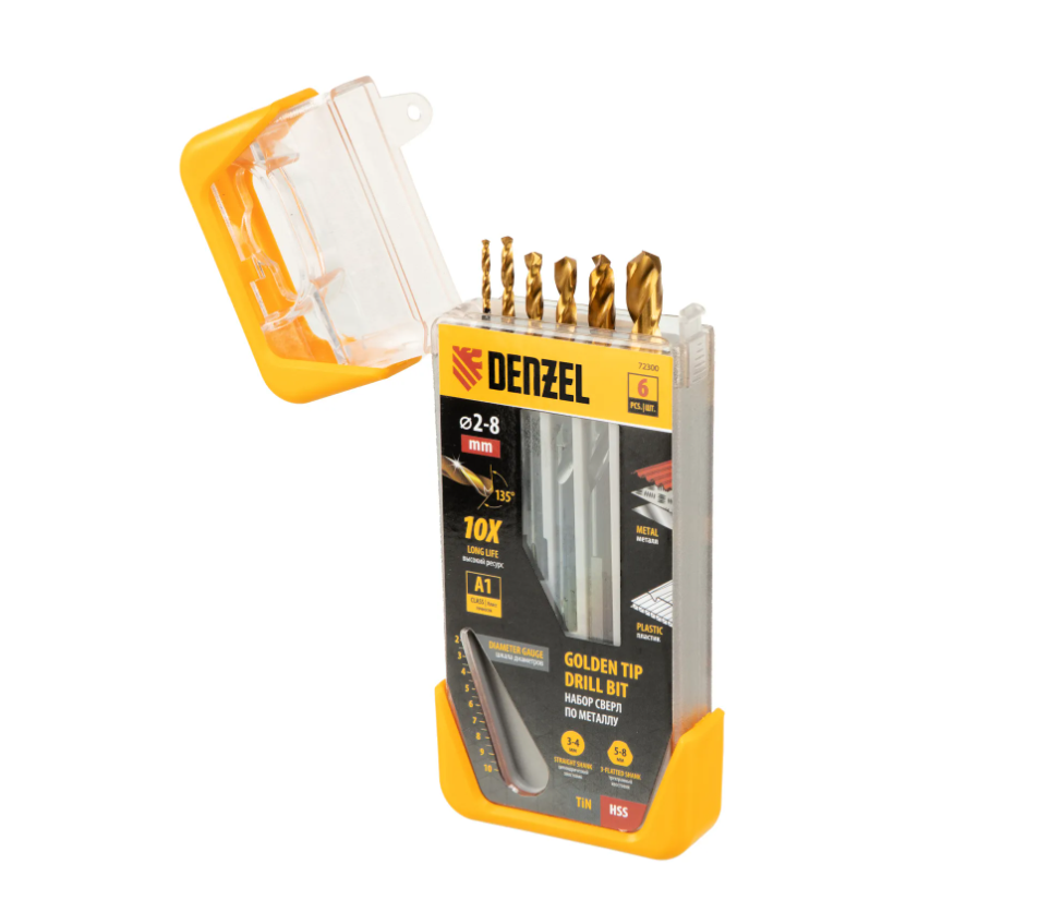 Denzel Набор сверл по металлу, 2-3-4-5-6-8 мм, HSS-Tin, Golden Tip, 6 шт 72300