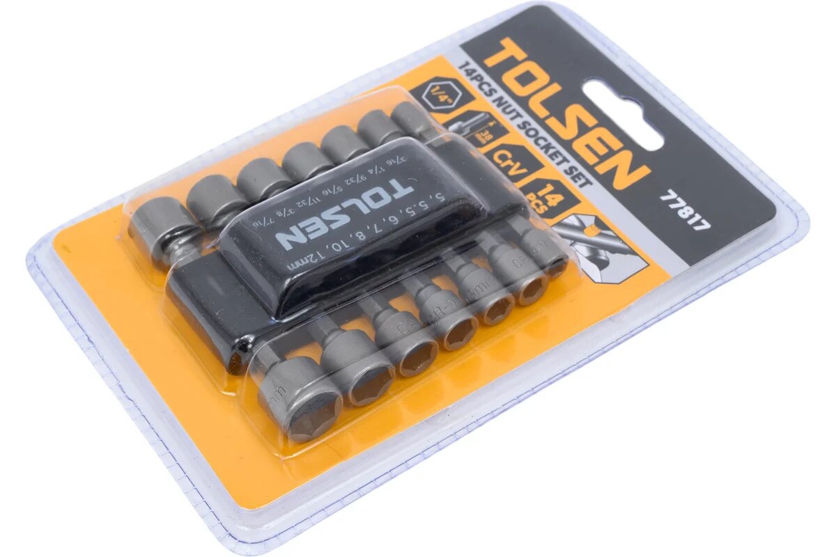 Отзывы на TOLSEN Набор головок для шуруповерта шестигранных 1/4", 5-12 мм, 3/16"-7/16", 14 предметов 77817