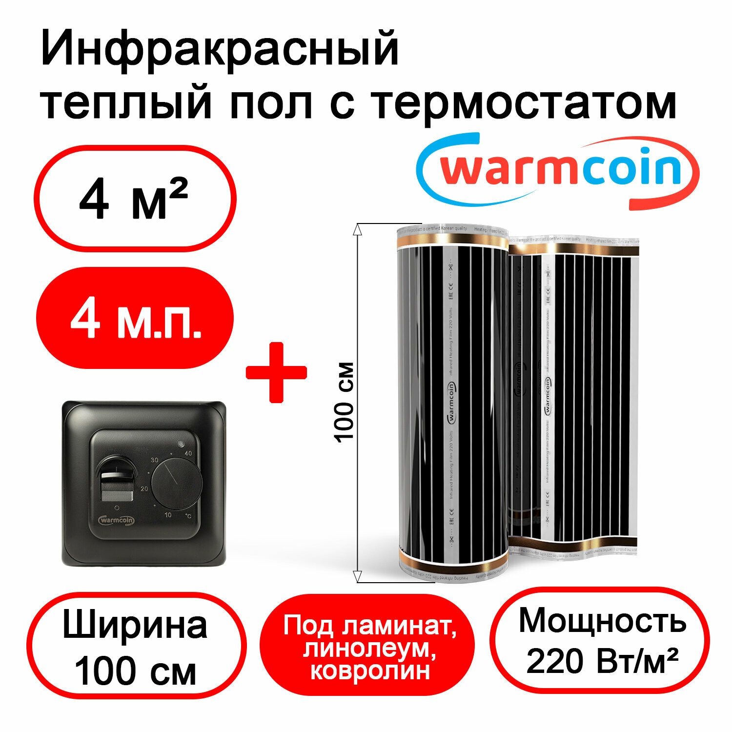 Теплый пол Warmcoin инфракрасный 100см, 220 Вт/м. кв. с черным механическим терморегулятором, 4 м. п информация: