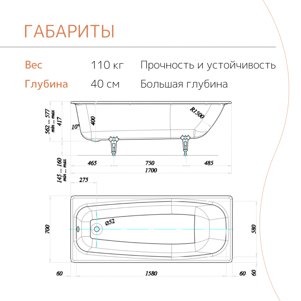 Чугунная ванна tempra Sevilia 170x70 см белая, глянцевая, с ножками информация: