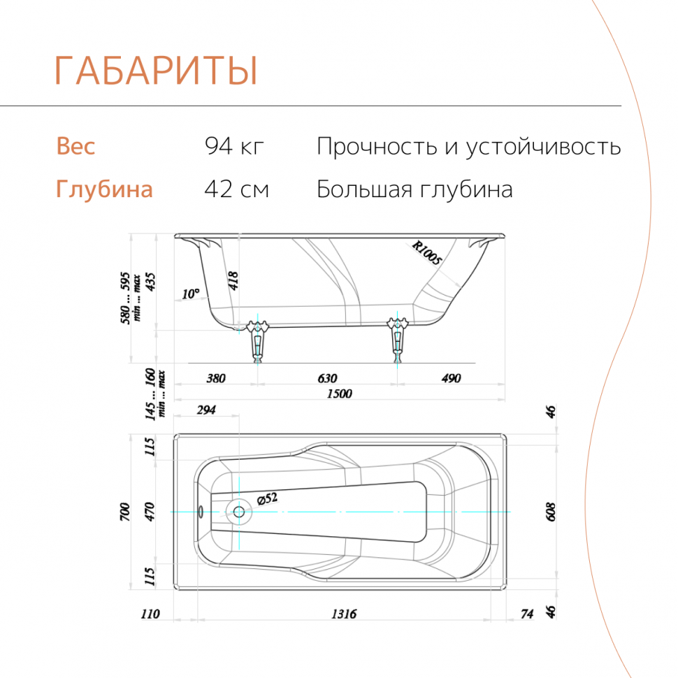 Отзывы на Чугунная ванна tempra Lima 150x70 см белая, глянцевая, с ножками и округлыми ручками