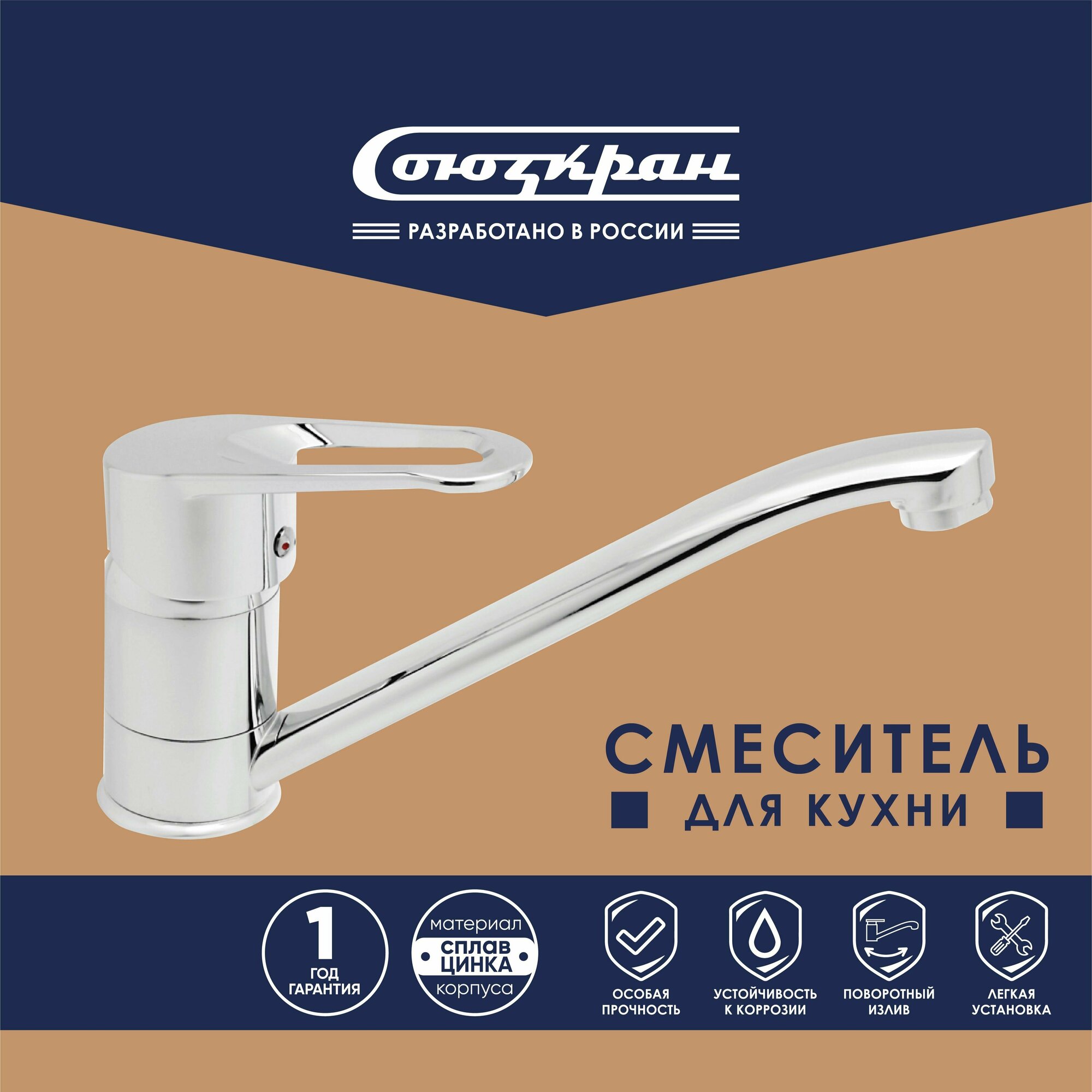 СоюзКран Смеситель для кухни, поворотный излив 25см, керам. кран-буксы 1/2, хром, цинк, SK01-G208