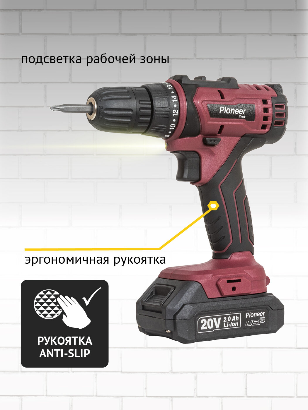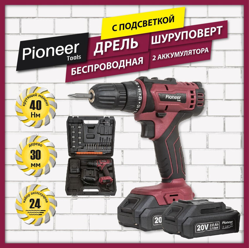 Отзывы на Дрель шуруповерт аккумуляторная Pioneer CD-M2002C USP, 2 скорости, реверс, 18 уровней+сверление, подсветка рабочей зоны