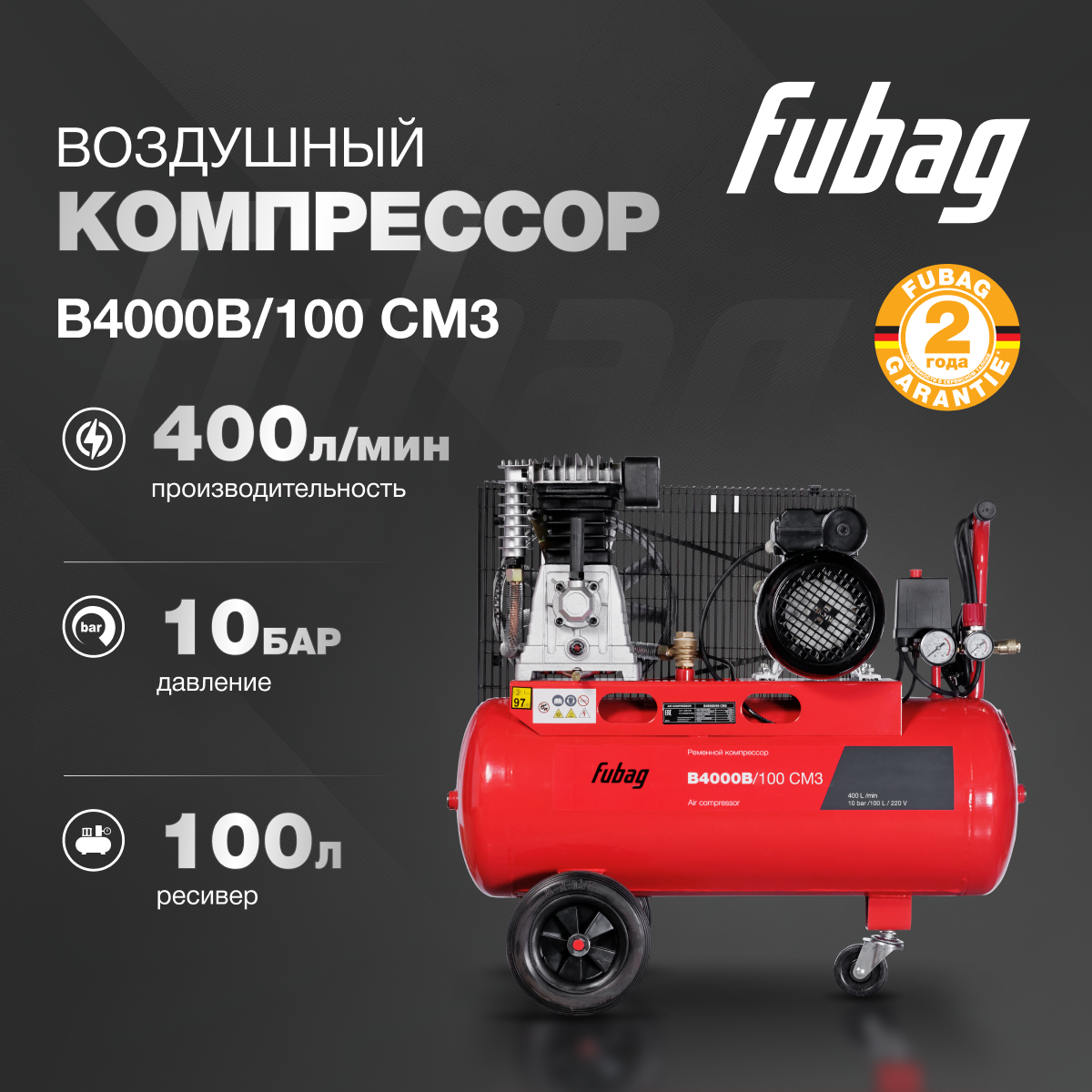 Компрессор воздушный ременной FUBAG B4000B/100 СМ3, 400 л/мин, ресивер 100 л, 10 бар, 220 В информация: