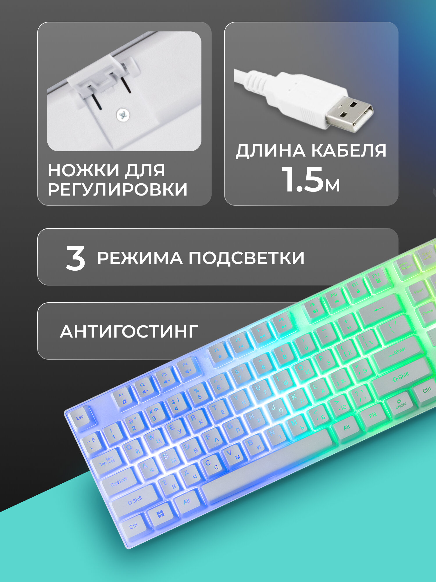 | Дополнительная информация | Прочный USB-кабель 1,5 м; подсветка Rainbow клавиш и символов |