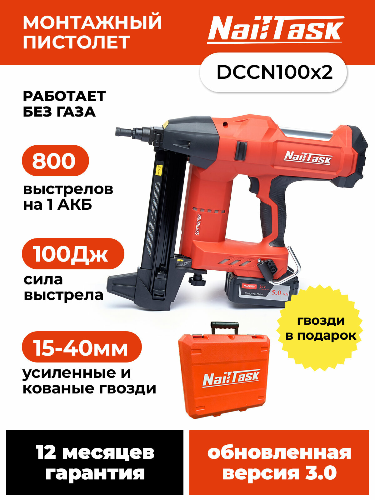 Монтажный аккумуляторный пистолет по бетону NAILTASK DCCN100x2 информация: