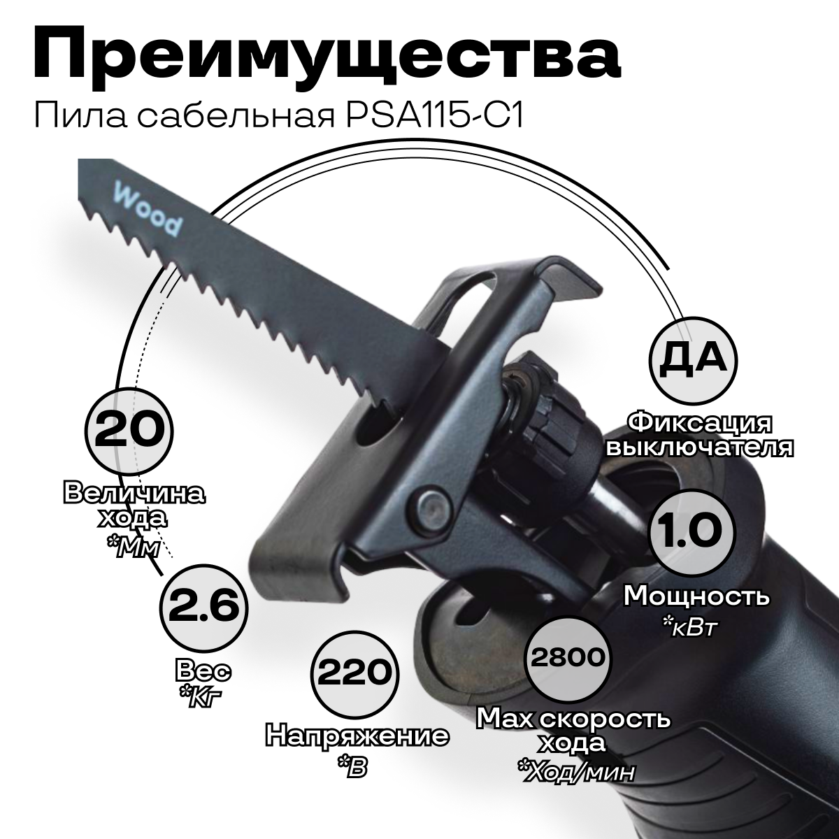 Пила сабельная PSA115-C1 (1000Вт, 0-2800об/мин, поворот рукоятка, ход20мм, съем креп, пилки дер/метал)