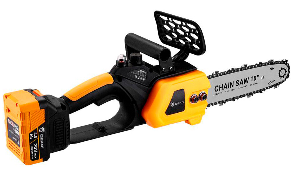 Отзывы на Пила цепная аккумуляторная Deko DKCHS 20, 10', 20В, 1x4.0Ач, з/у, черно-желтый