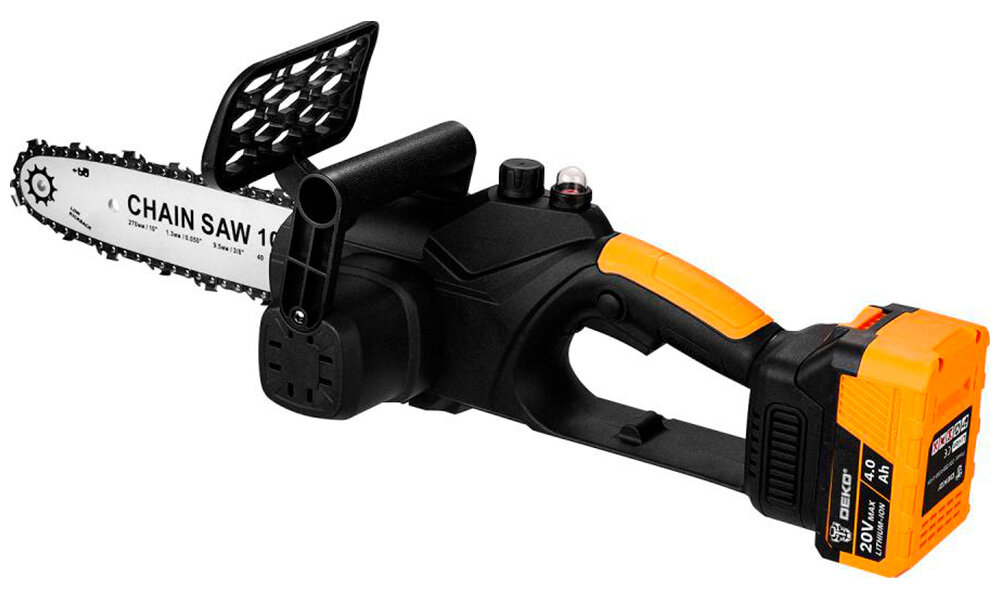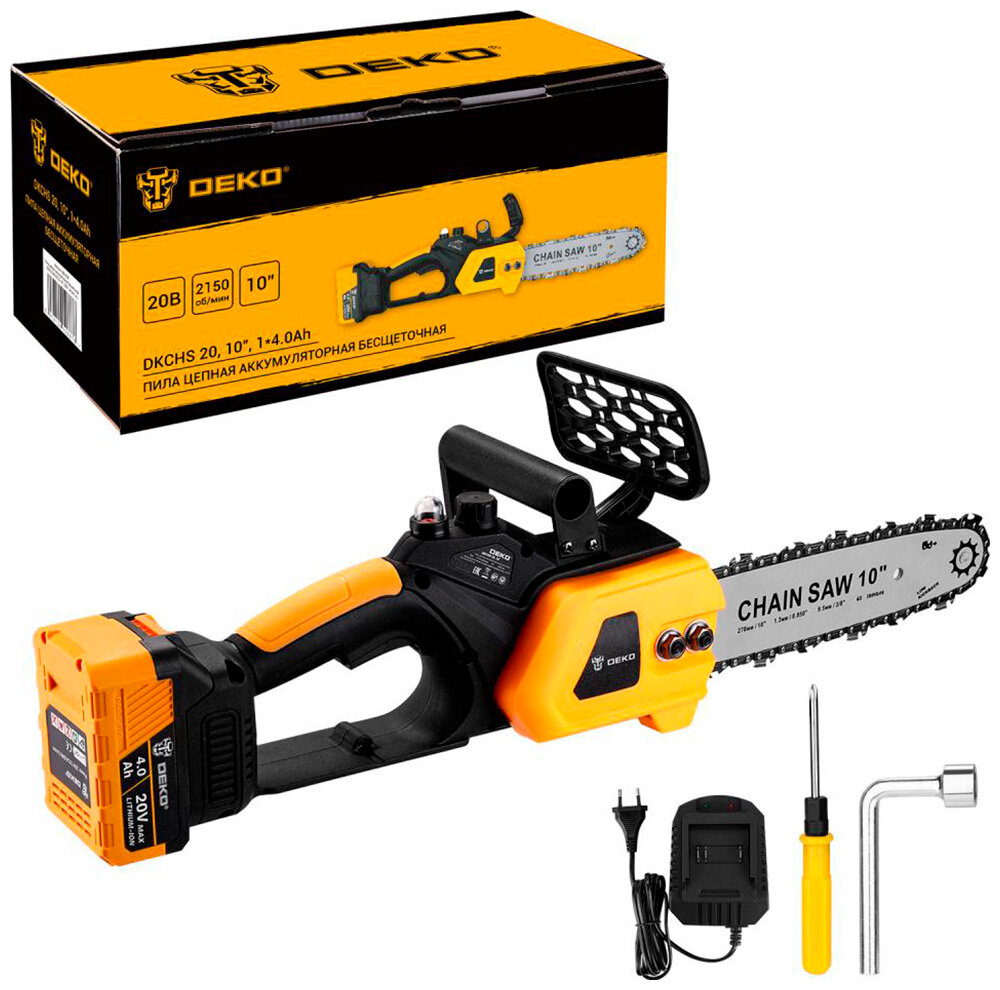 Пила цепная аккумуляторная Deko DKCHS 20, 10', 20В, 1x4.0Ач, з/у, черно-желтый информация: