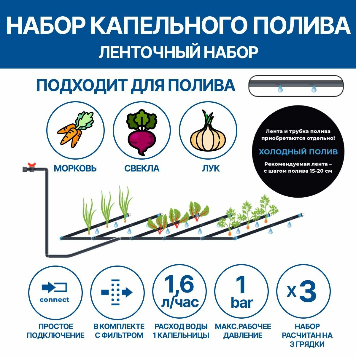 Набор фитингов для капельного полива корнеплодов (лук, морковь, свекла, редис) информация: