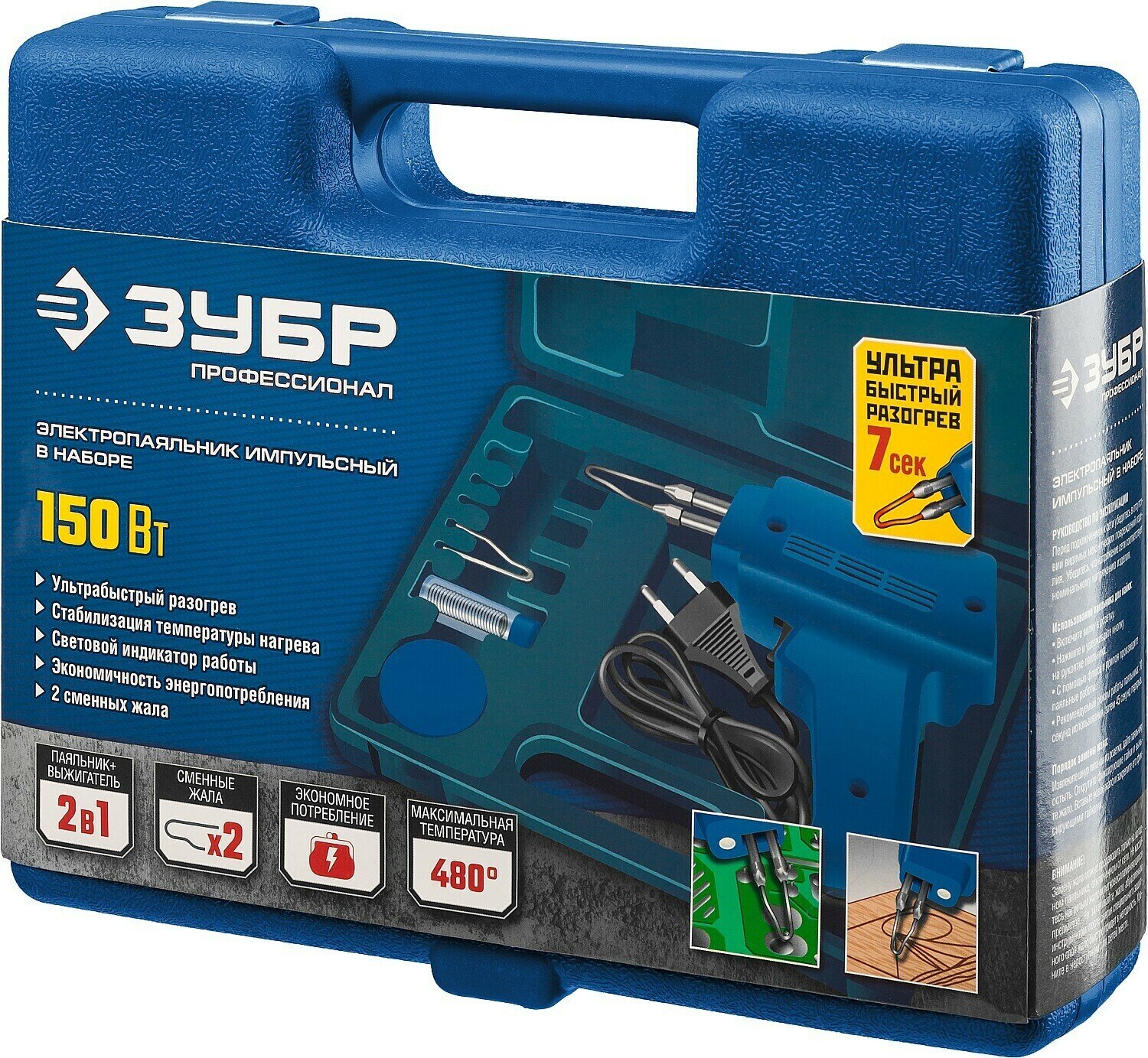 ЗУБР 150 Вт, в наборе: нагрев 6 сек, канифоль, припой, 2 сменных жала, импульсный паяльник, Профессионал (55412-H4) информация: