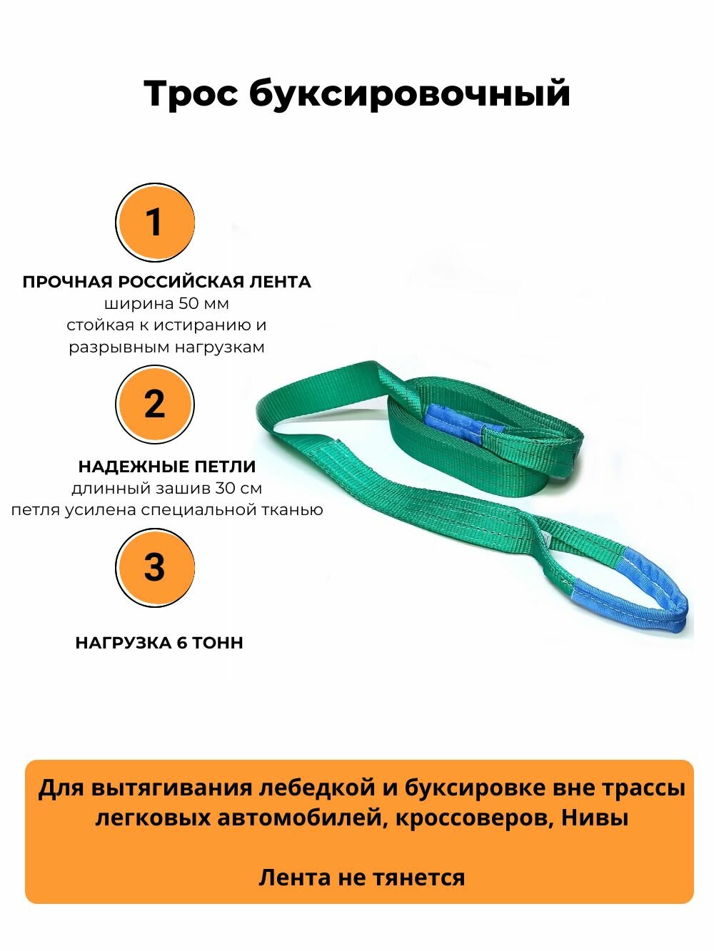Отзывы на Буксировочный трос для автомобиля 6т 5м петля-петля (лента 50 мм)