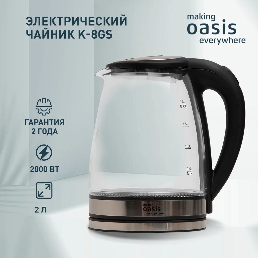 Чайник электрический Oasis K-8GS, 2 л, 2000 Вт, стекло, стальной информация: