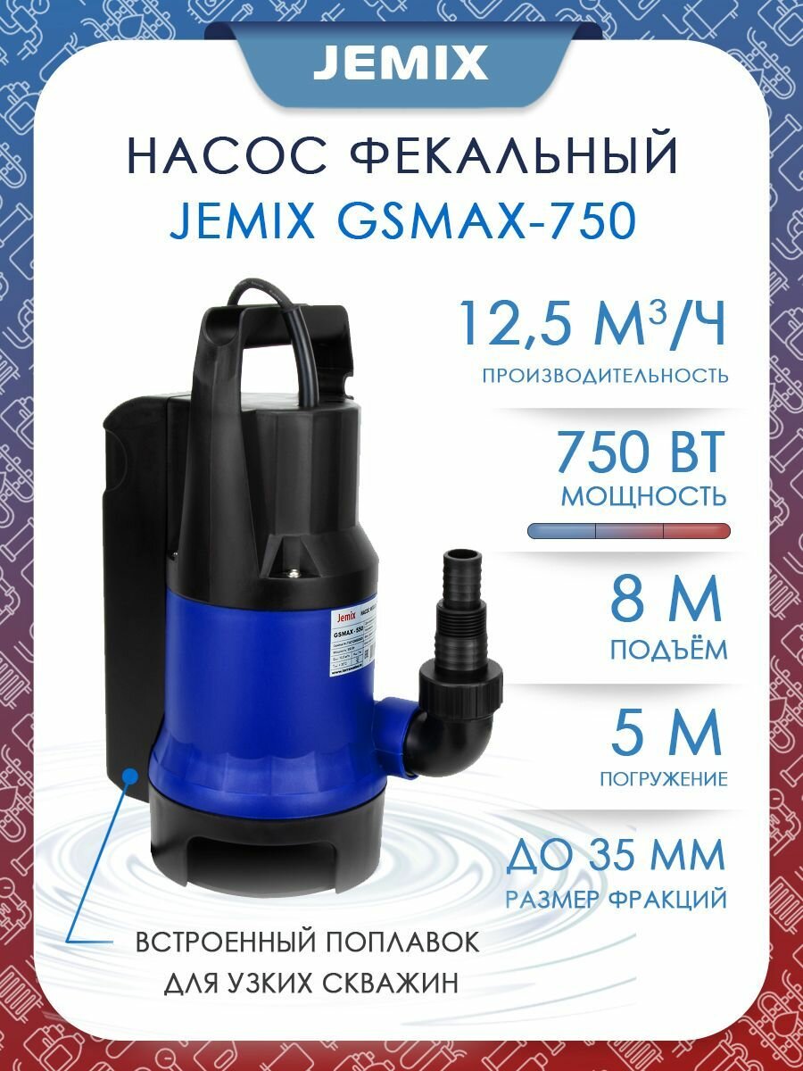Насос фекальный GSMAX-750 (750 Вт/12500л.ч/8м/35мм/кабель 10 м/встроенный поплавок) JEMIX 5 291 ₽
