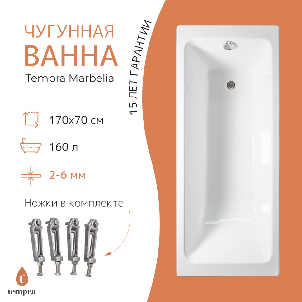 Чугунная ванна tempra Marbelia 170x70 см белая, глянцевая, с ножками информация:
