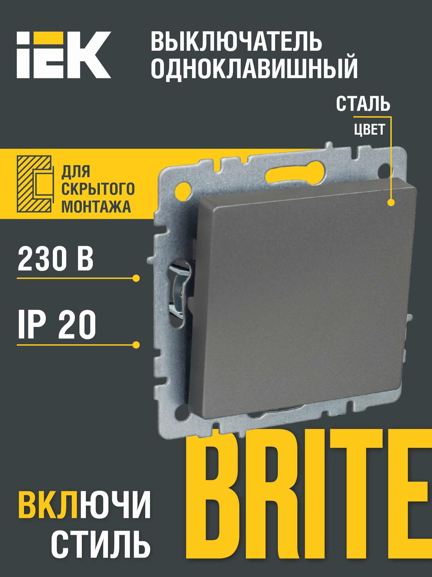 BRITE Выключ. 1-кл. 10А ВС10-1-0-БрС сталь IEK информация: