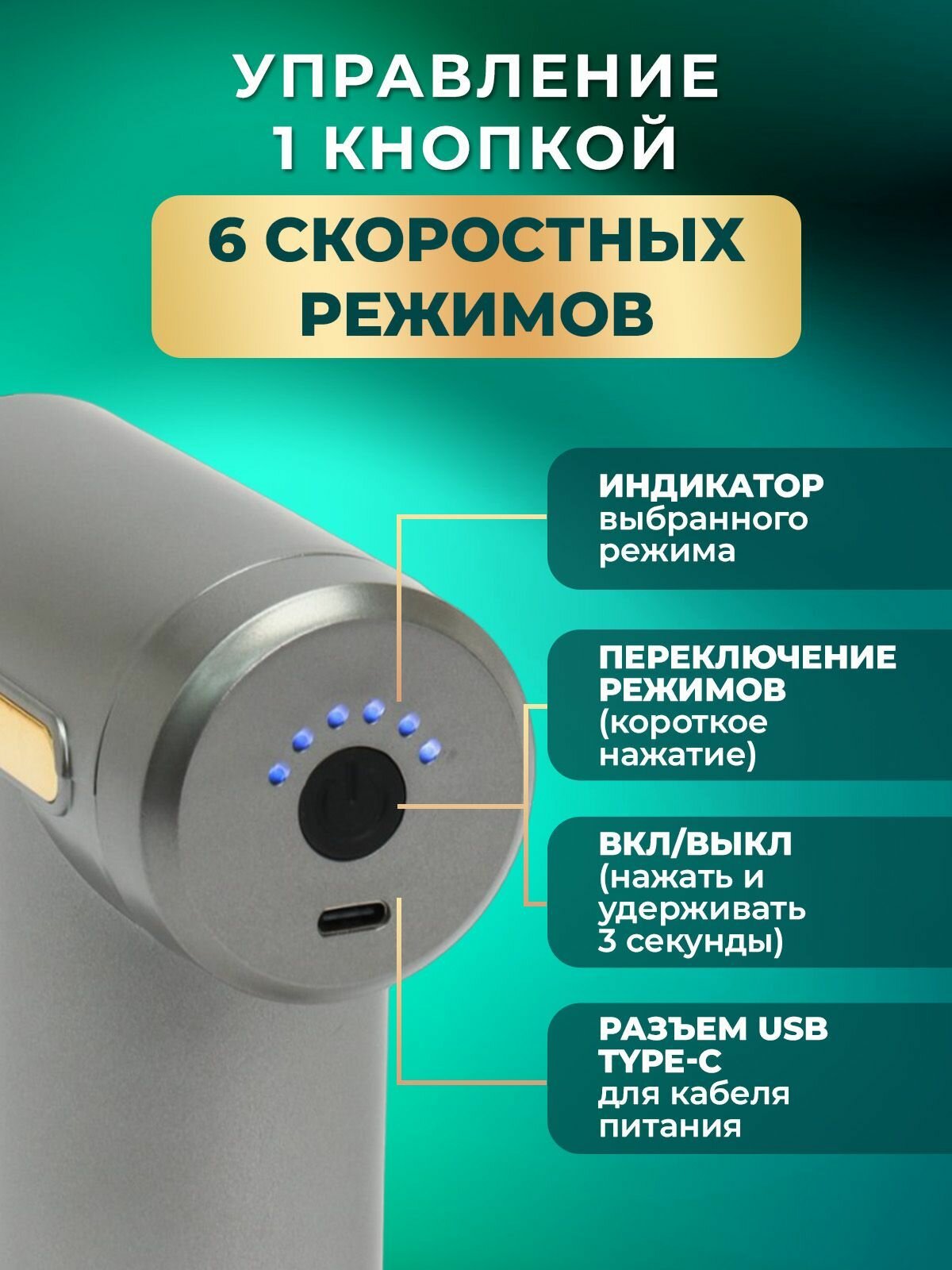 Перкуссионный массажер для тела Classmark беспроводной массажный пистолет электрический для ног, рук, шеи и спины, 4 насадки на все группы мышц, 6 режимов работы, разъем usb type - C, серый 1 016 ₽