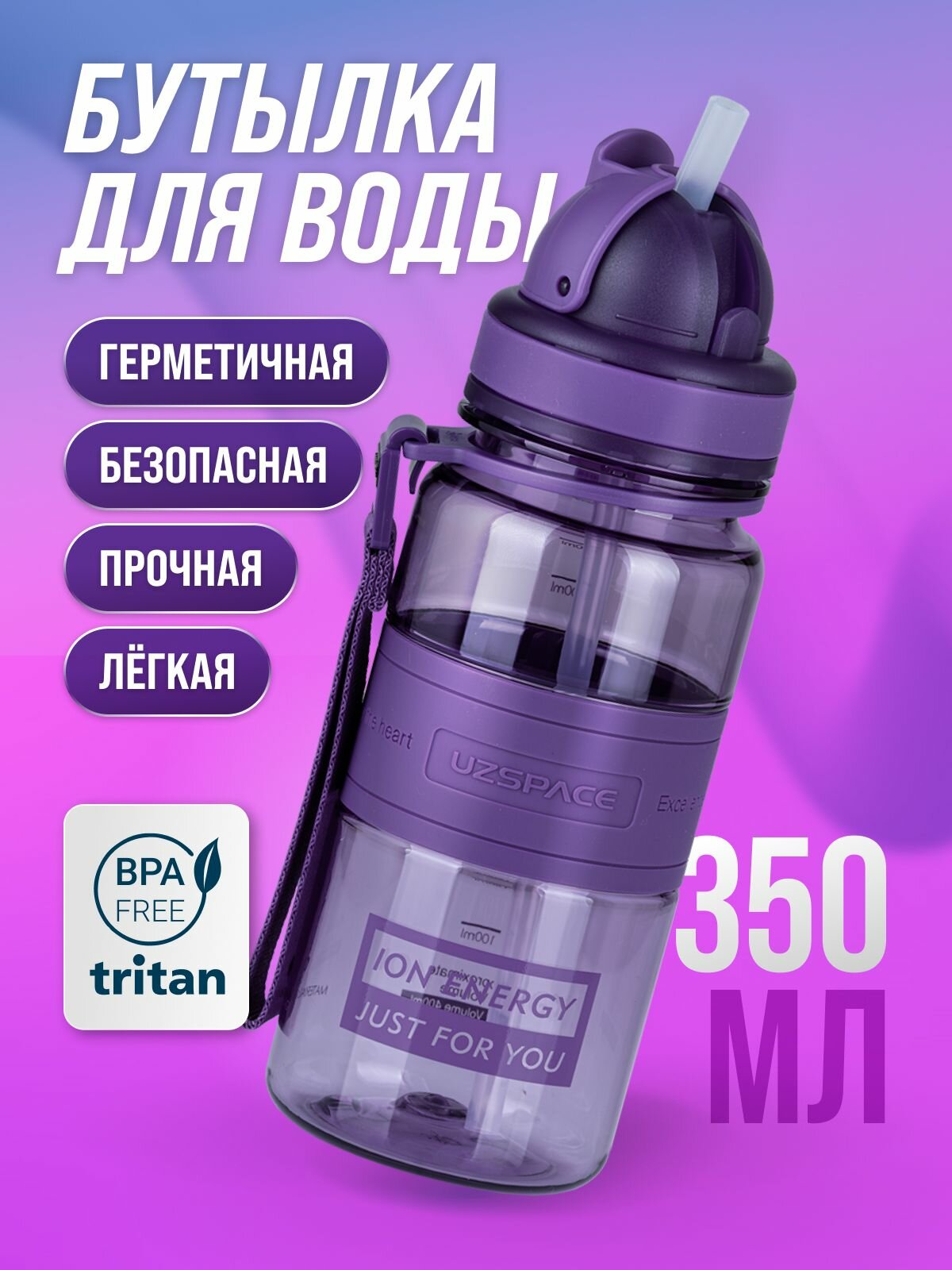 Бутылка для воды спортивная UZSPACE из Тритана, фиолетовая прозрачная, 350 мл, с трубочкой, герметичная крышка, BPA Free, для спорта и фитнеса, детская в школу информация: