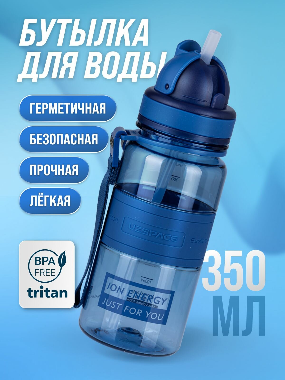 Отзывы на Бутылка для воды спортивная UZSPACE из Тритана, голубая прозрачная, 350 мл, с трубочкой, герметичная крышка, BPA Free, для спорта и фитнеса, детская в школу