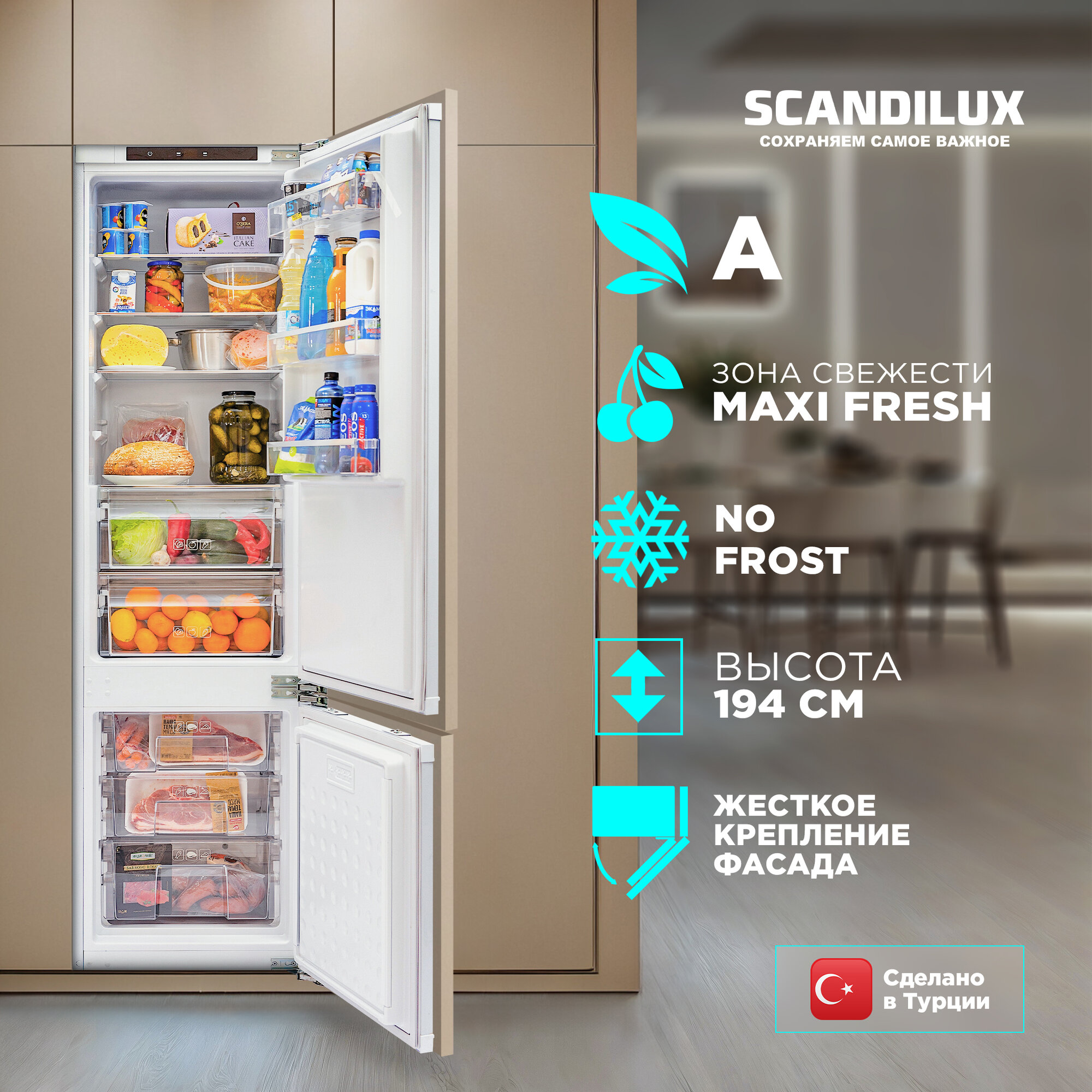 Встраиваемый холодильник двухкамерный SCANDILUX CNFBI210E NO FROST, Петли Door on Door, жёсткое крепление фасада, Высота 193 см, Объём 315 л, LED подсветка, электронное управление, Энергопотребление А, производство Китай информация:
