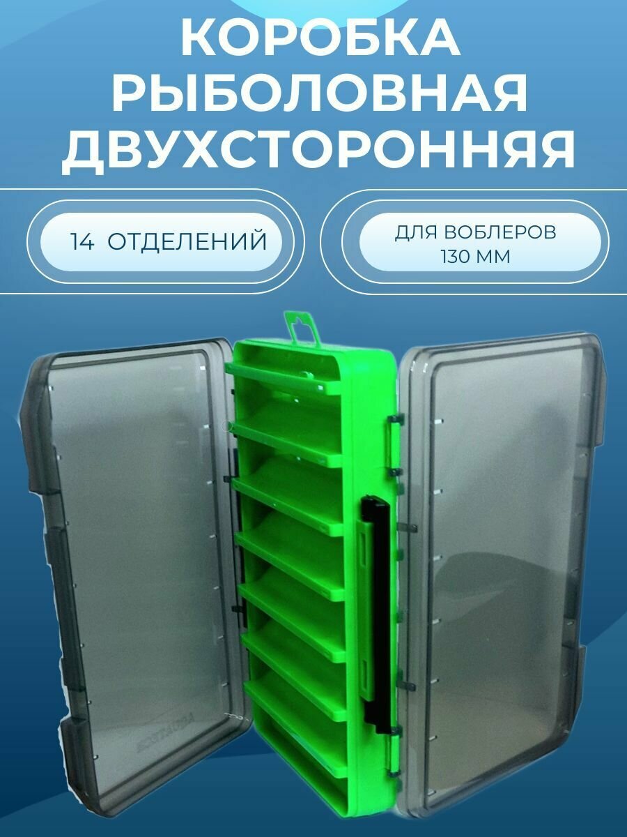 Коробка для приманок / воблеров двухсторонняя Aquatech 17300 (200х125х38мм), 14 ячеек, приманки до 80 мм, зеленая