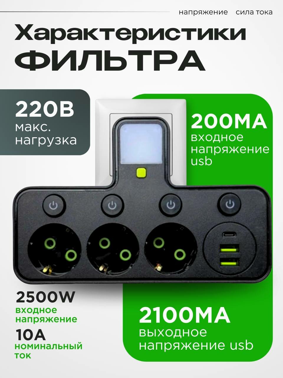 Отзывы на Тройник-разветвитель MANSTOR, 3 розетки, 2 USB, Type-C, с подсветкой, черный