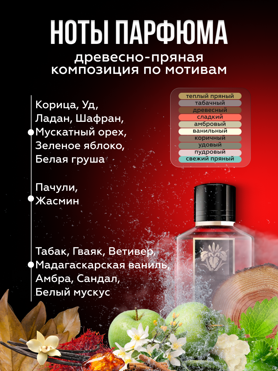 | Ноты | Верхние ноты: Корица / уд / шафран / ладан / мускатный орех / Зеленое яблоко и Белая груша; средние ноты: Пачули и Жасмин; базовые ноты: Табак / мадагаскарская ваниль / амбра / сандал / Гваяк / Белый мускус и Ветивер. |